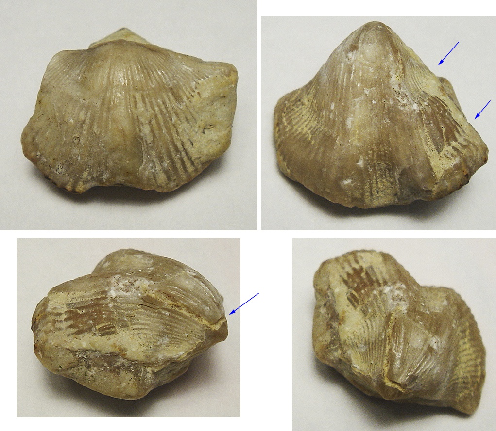 вот хороший пример Нарушение симметрии у Angiospirifer в результате повреждения и вот еще пример "Зубастая" из Карбона толщина раковины всего 2 мм и это не вид такой был - это деформация породы тк там их вообще в клочья разрывало Брахиоподы , поэтому надо смотреть по аналогичным находкам.