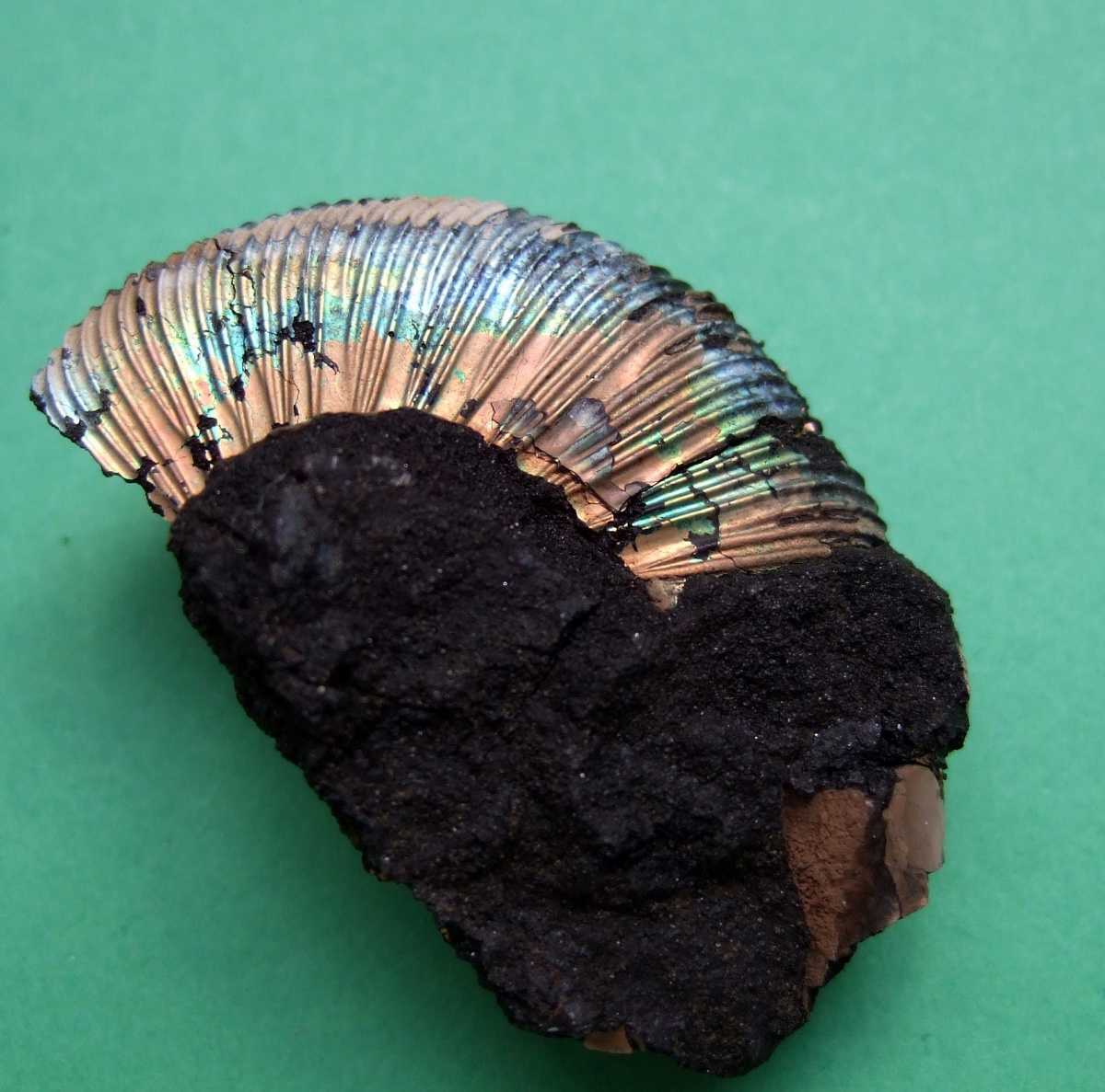 Аммонит расколот не две части. Максимальный размер 65 мм. Фрагмент с другой стороны с хорошо сохранившимся перламутром.