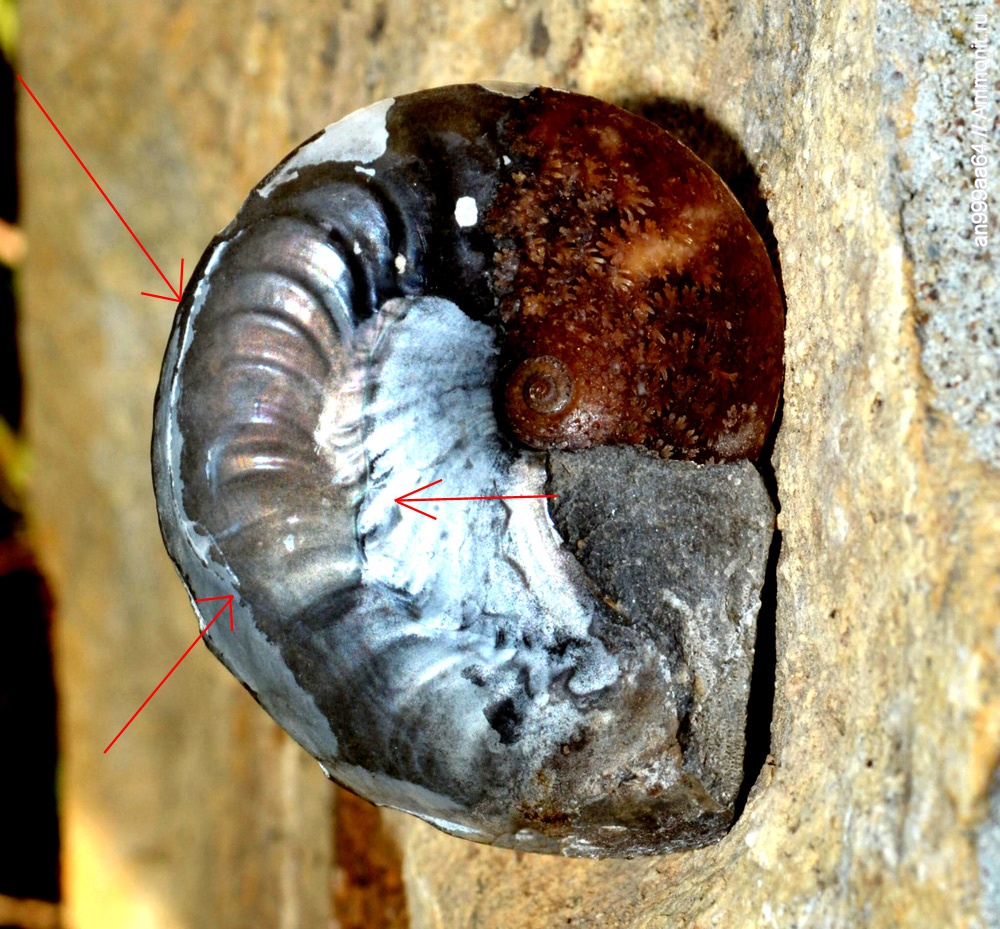 Очень красивый аммонит! Все у него на месте, прямо учебное пособие по биологии аконецерасов )) И аммонителла в центре, и лопастные линии, и устье, и отпечаток мускула. Насчет мускула, вот тут я его отметил, прошу прощения за обработку фотографии, но решил сделать так, чтобы было понятно что я имею ввиду. Отпечаток большой - почти половина длины жилой камеры. Они у Aconeceras не редкость, но и не то чтобы уж очень частая находка. | ||||||
