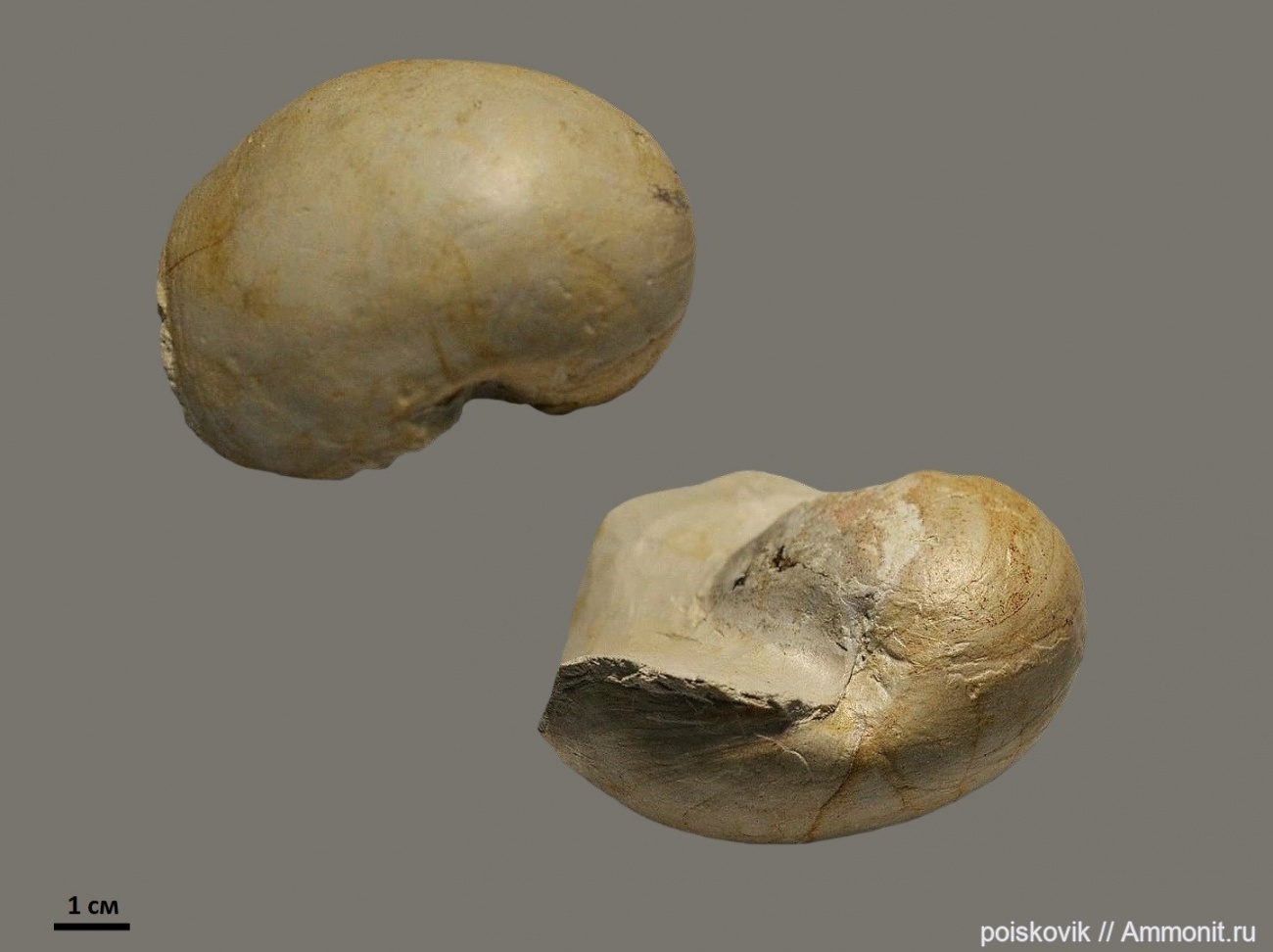 Это ядро наутилуса с полностью сохранившимся устьем извлечено из верхнемеловых мергелей. Единственное - внутри жилой камеры часть мергеля вычистили микродрелью. Всего нами найдено два подобных головоногих (см. фото) и при разных размерах - форма их идентична. | ||||||