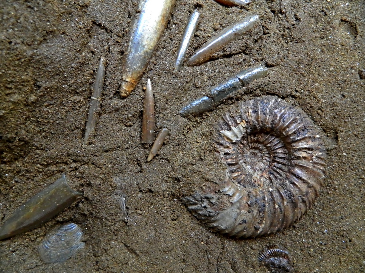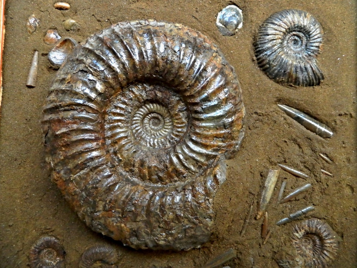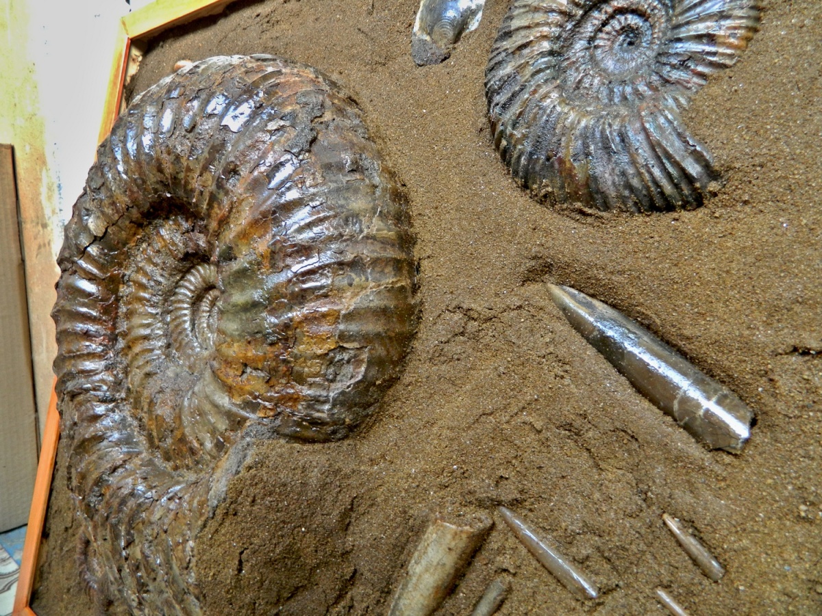 Натуральные аммониты, белемниты и двустворки на натуральном матриксе из песчаника. Тяжелая получилась "штуковина", около 50 кг.