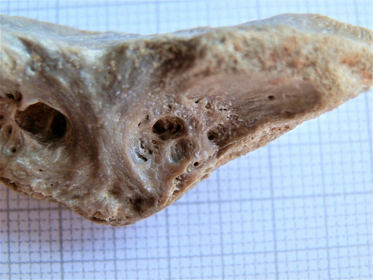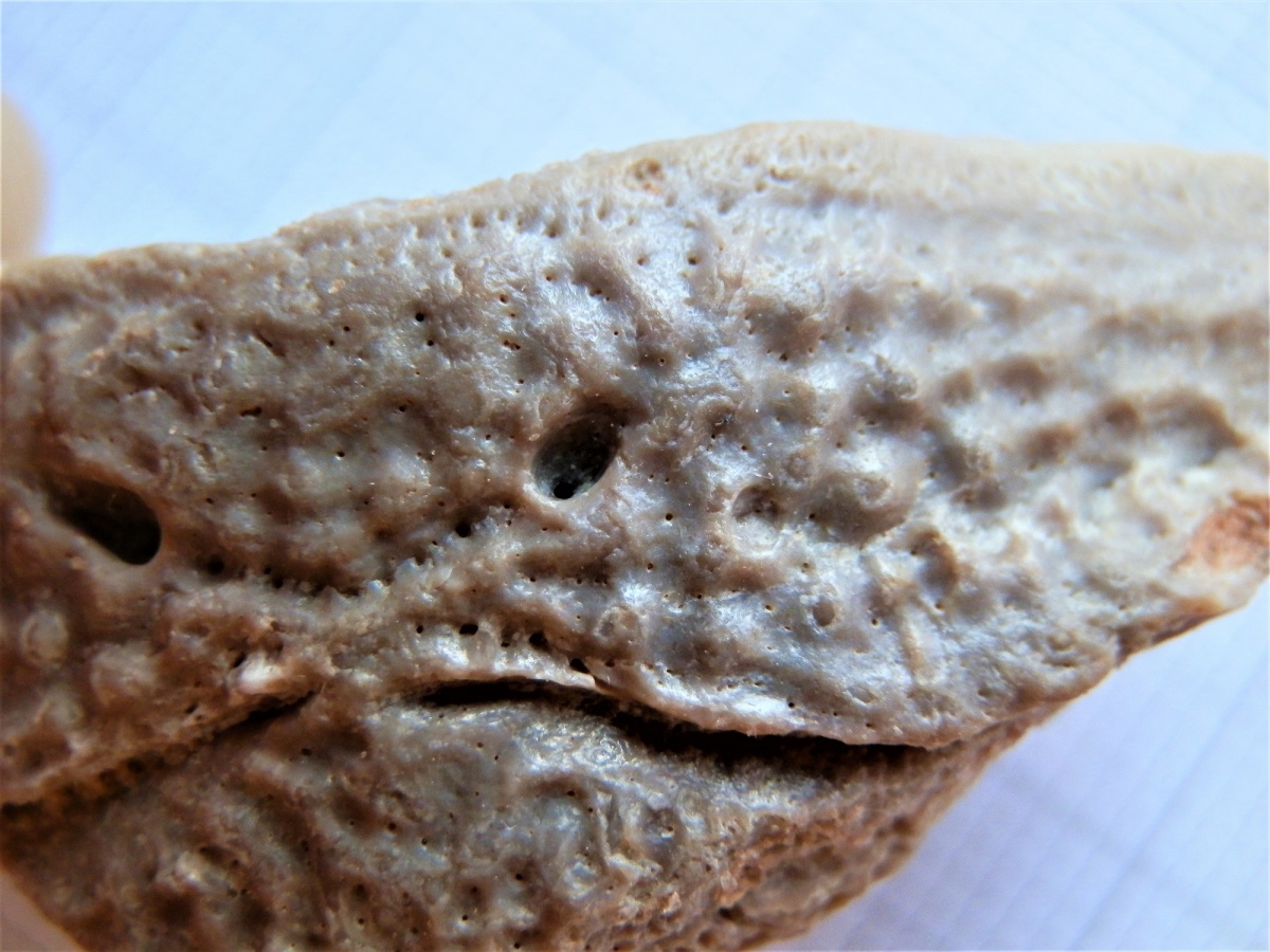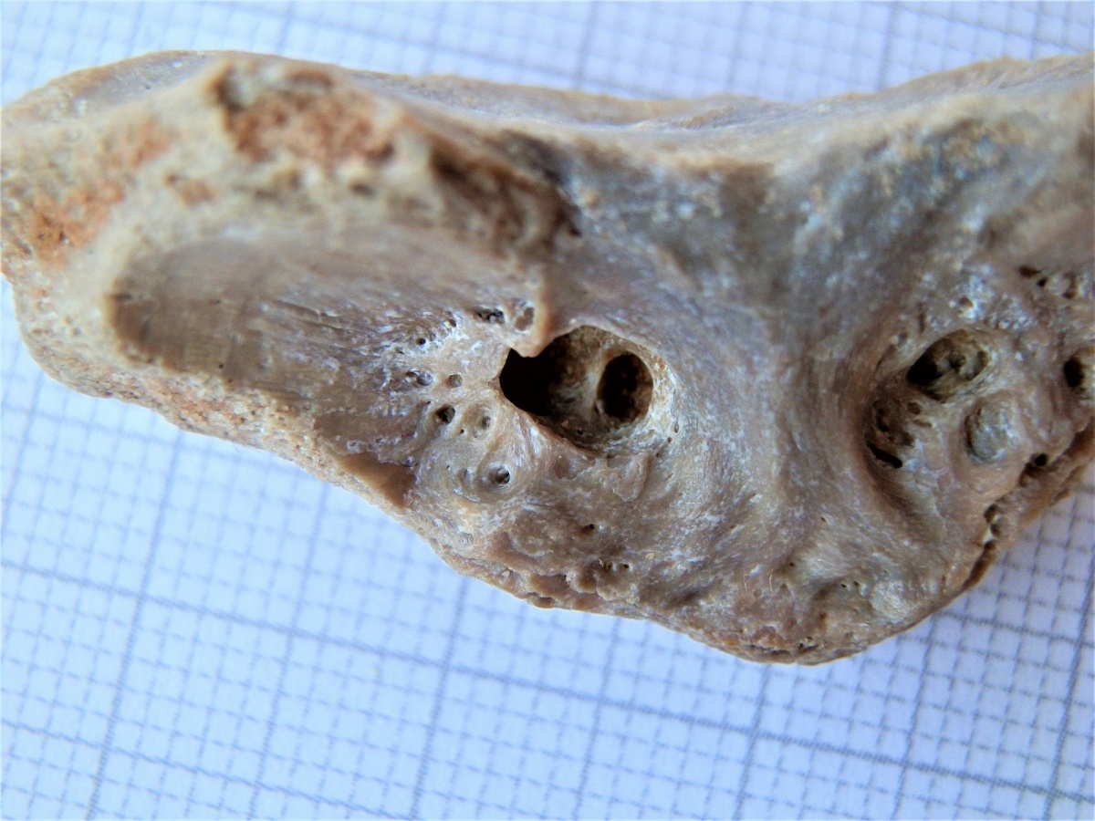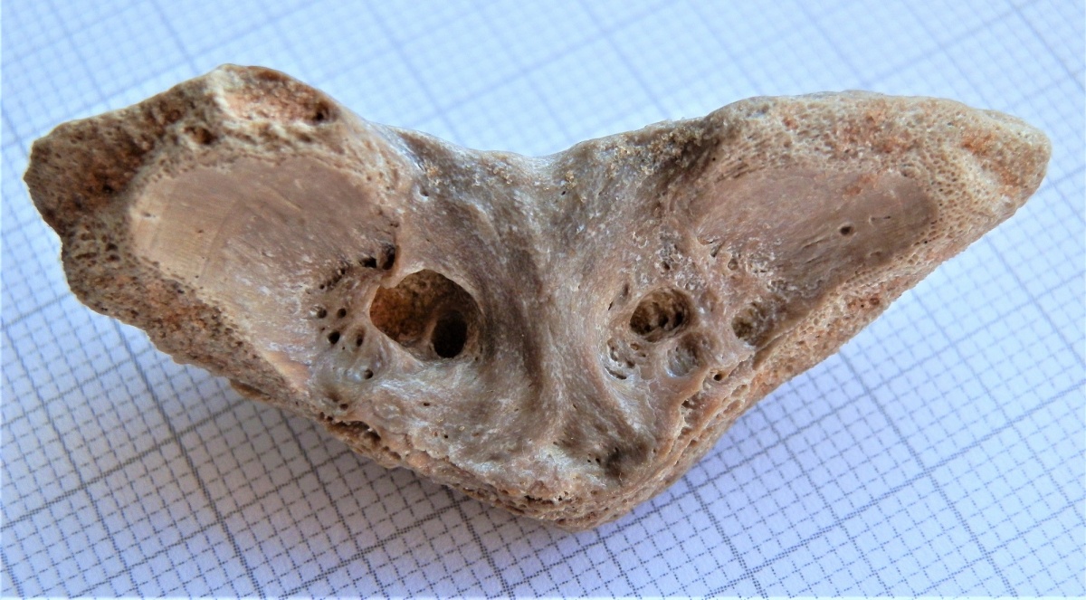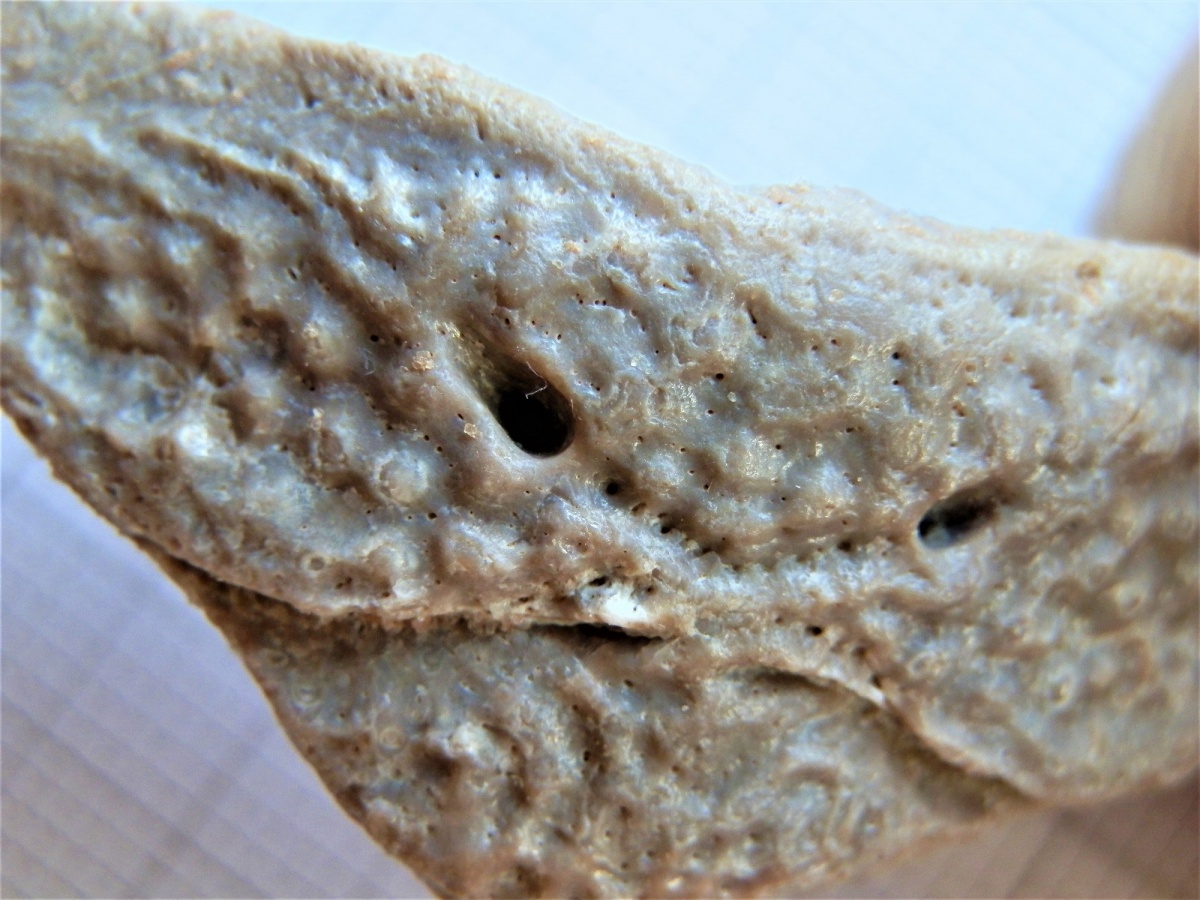 Найденный в субботу фрагмент головы Asterolepis ornata определил как postpineale plate, на этом Фото обведён красным. После расчистки открылись интересные симметричные отверстия напоминающие две ноздри , на фото ниже в разных ракурсах.