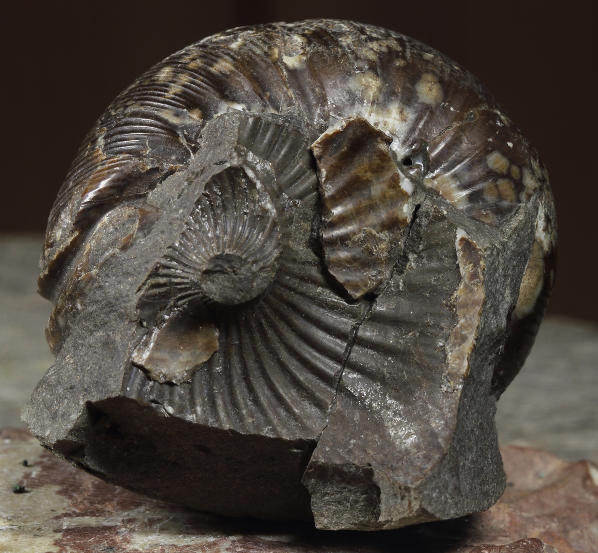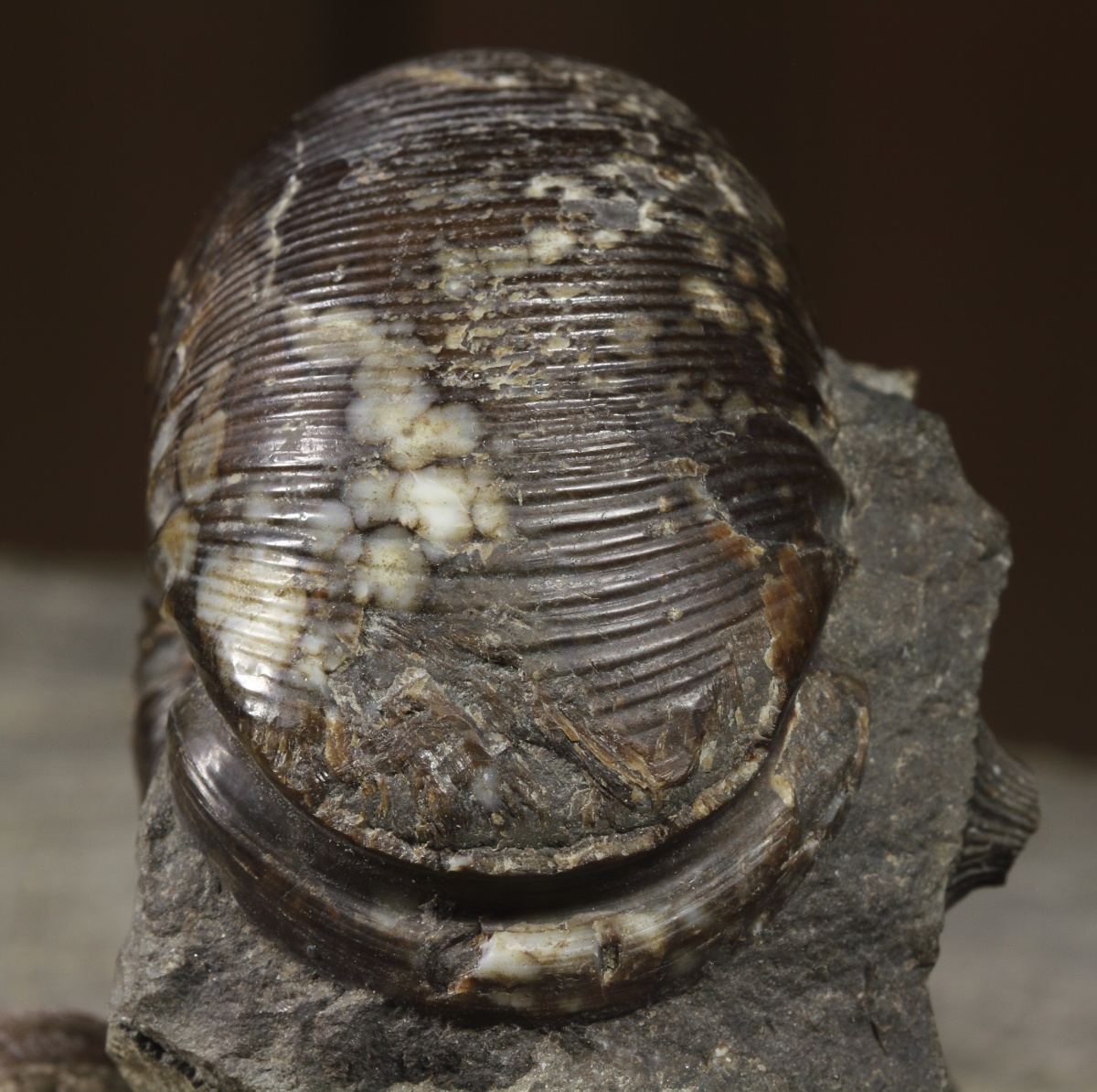 Редкий и желанный аммонит наряду со Stephanoceras в зоне Humphriesianum. Почти максимальный размер для макрохонха. Один из лучших, в раковине. Фото, Фото. Был второй в этой же конкреции, разбился, без возможности склеить. Какой то минерал с группы цинка со совершенной спаиностью, разлом пришелся по его плоскости, а не по раковине Фото