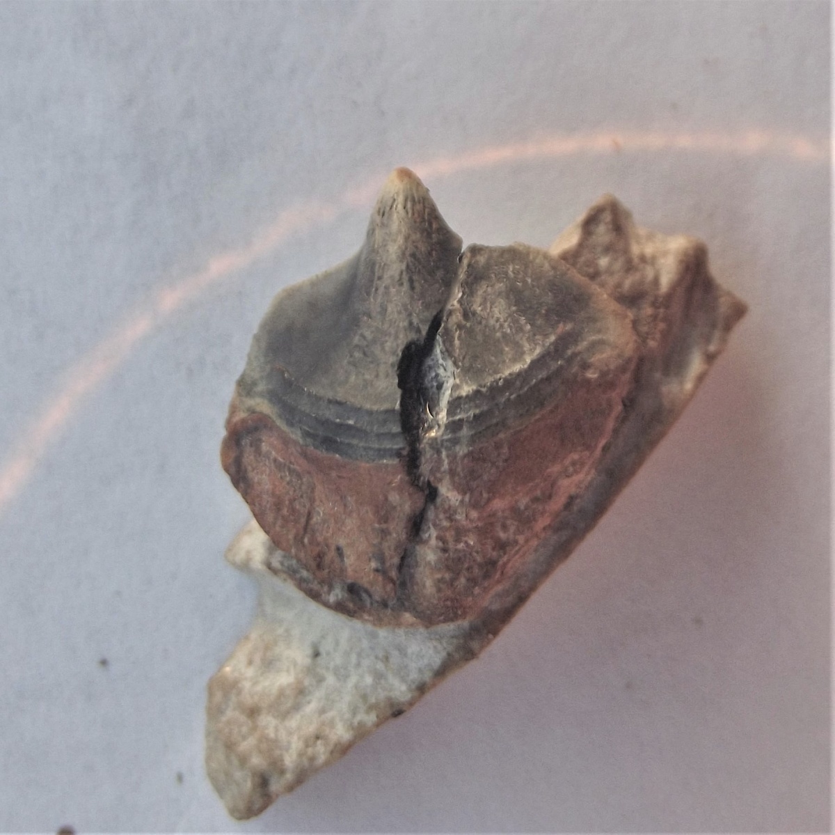 Очевидно верхний зуб. Вообще-то для этого карьера характерна очень неважная сохранность рыбьих остатков. Если точнее, то от многих объектов осталась только тень или полости, наполненные трухой. Поэтому сохранность коронки у представленного зуба была приятным сюрпризом, и по поводу несохранившегося корня уже никаких претензий к природе.