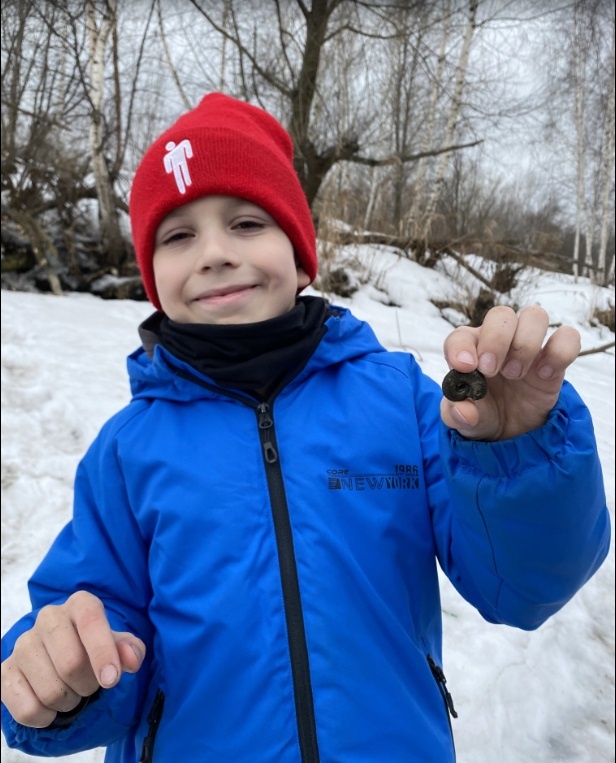 Во вторых, аммонит будто кто-то принес из Бронниц и выронил из кармана, он отличается замещением от всего, что нам попадалось в Москворечье. Даже кусочек большого Амобоцераса мы встречали там чёрный (фосфоритовый?), а этот малыш (его длина 2,5 см) пиритовый.