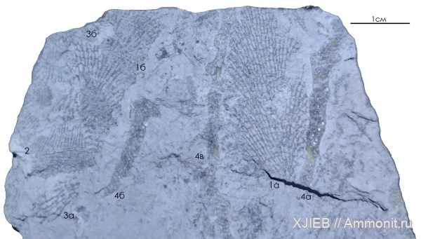 Плиточка глинистого сланца с отпечатками четырёх видов мшанок: