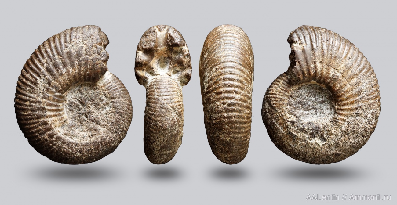 На этих оборотах аммонит похож и на Serbarinovella и на Taimyrosphictes. Не видно пупка. У сербариновел пупок гладкий и похож на краспедитовый. У таймыросфинктов - пупок ребристый дорзопланитидовый. Первые жили во время virgatus, вторые - в nikitini. | ||||||