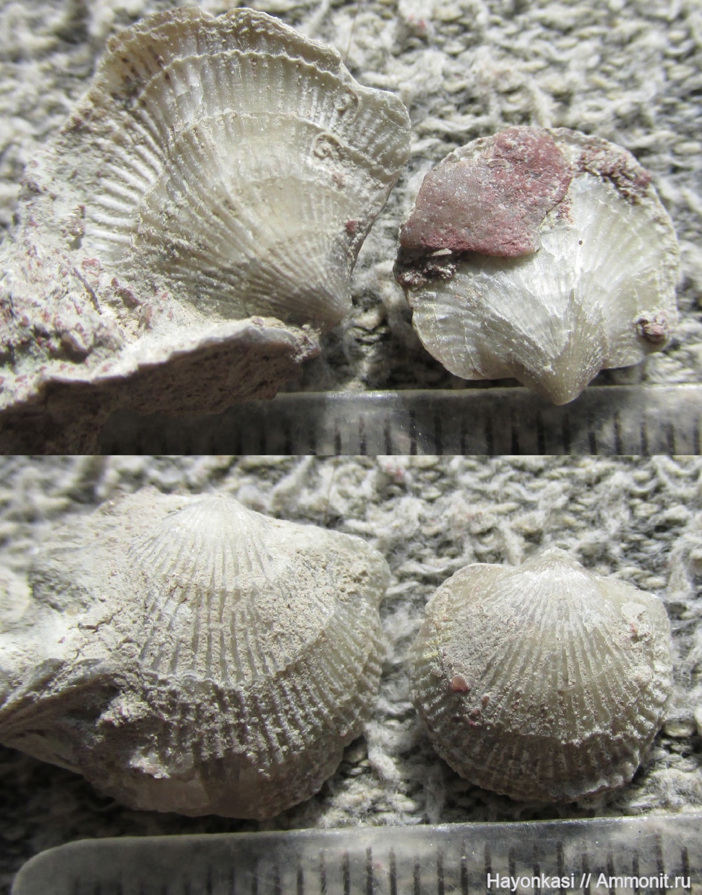 Брахиоподы Atrypida (предположительно Pseudoatrypa velikaya). Правая ещё двояковыпуклая, у левой начинает подгибаться шлейф. Ещё у левой прижизненная вмятина на нижней створке. И микроконхиды, куда же без них...
