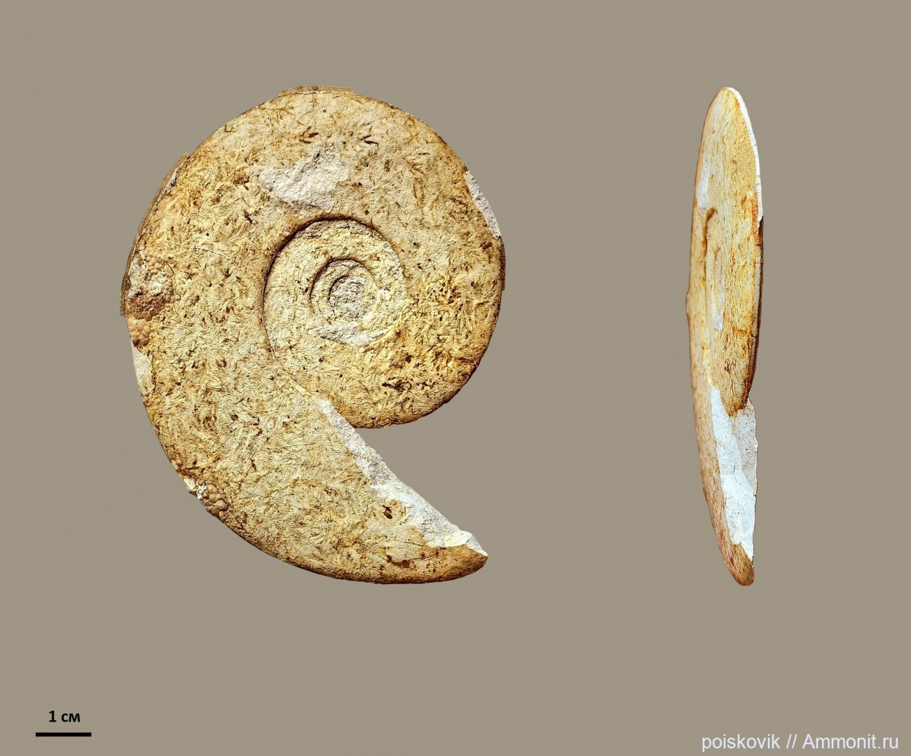 Ядро фрагмокона дисковидного аммонита Hauericeras (в 2-х проекциях). По-видимому, было существенно сжато породами при захоронении. Место находки см. Верхнемеловые окаменелости Белогорского района .