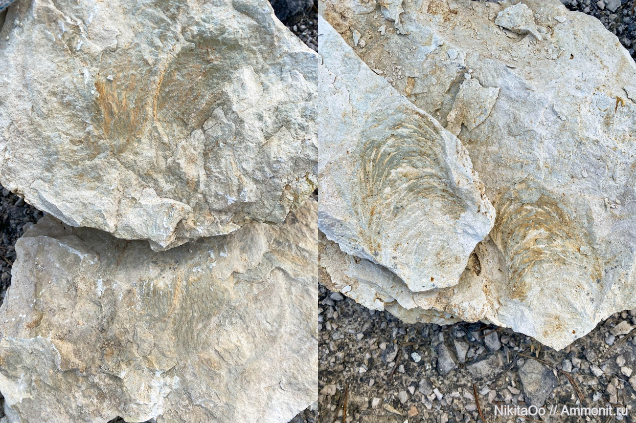 При раскалывании булыжника обнаружились такие интересные "рисунки" на половинках. По неопытности было много предположений, что это, по самарским местонахождениям карбона ничего похожего не было. Затем случайно натолкнулся на фото зоофикусов, и "паззл сложился". Есть конечно сомнения, особенно насчет левого отпечатка.