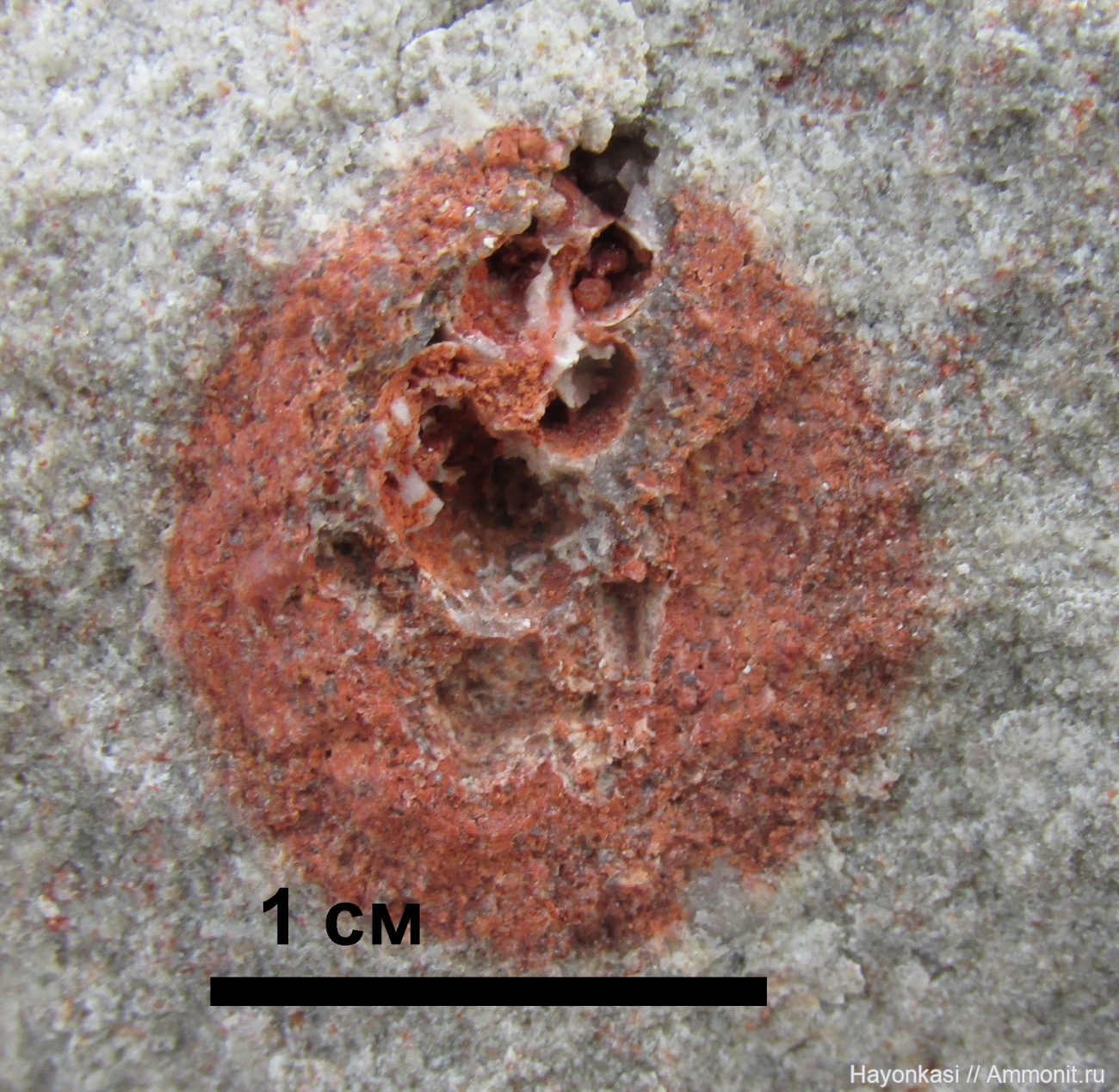 Остатки маленькой гастроподы. Раскол камня вскрыл её камеры. Ядра моллюсков в этой породе часто окружены такими красными "ореолами".