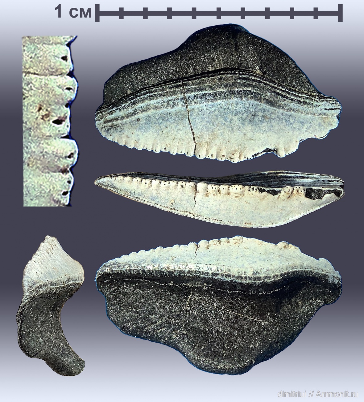 Один из немногих целых зубов оттуда. Это зуб чуть крупнее прошлого похожего зуба . На фото сверху слева привожу увеличенную проекцию кромки коронки. На основании зубчатой кромки коронки снова предположу, что это - боковой Ctenoptychius-а.