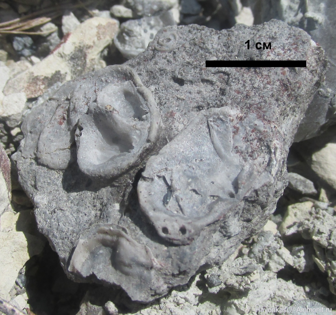 Фрагмент твёрдого дна с приросшими створками брахиопод Irboskites fixatus. Также тут "сидит" микроконхида.