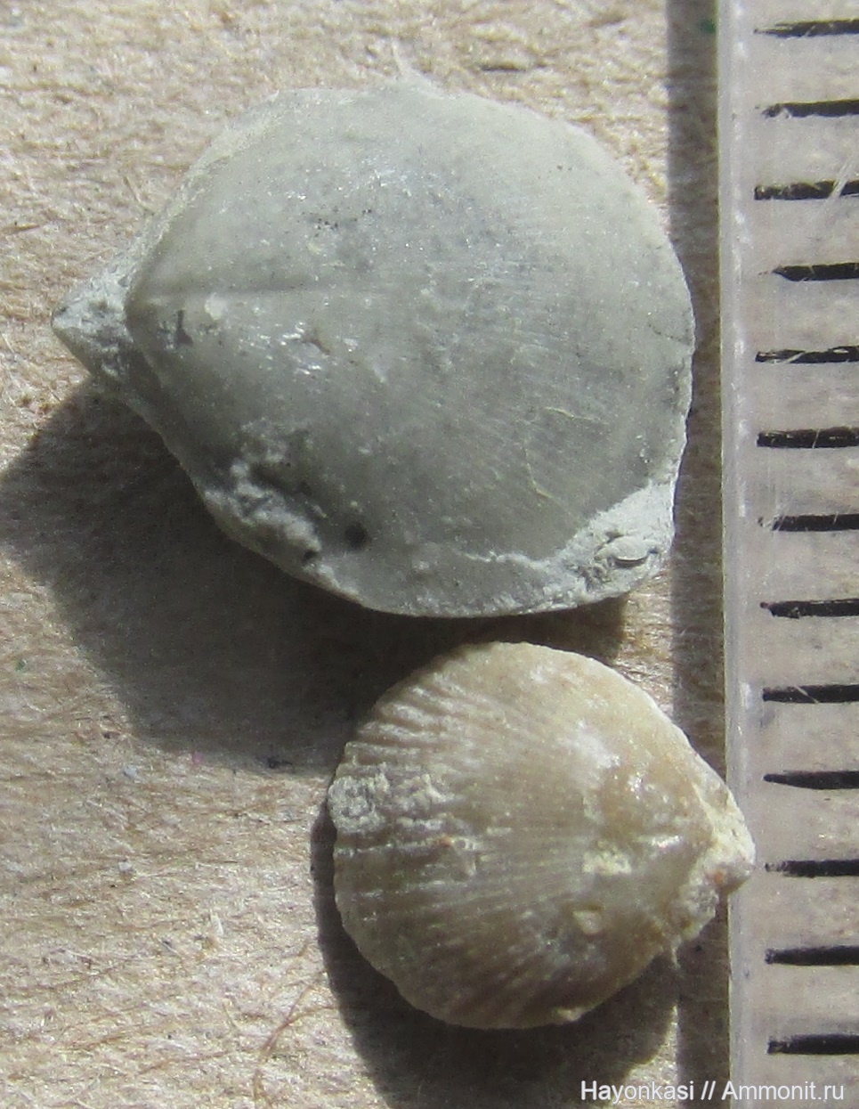 Две ювенильные брахиоподы Ринхонеллиды - сверху Ladogia meyendorfii, внизу Ripidiorhynchus sp. Редкий момент, когда два эти вида соразмерны. Взрослая Ladogia нависала бы над Рипидиоринхом, как скала.
