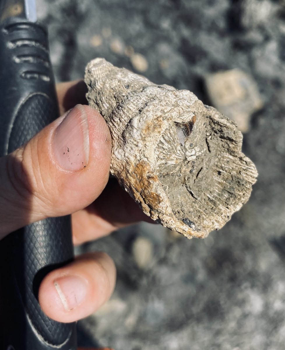 Уж не знаю, кто кого тогда ел: ругозы рыб или же рыбы кальций восстанавливливали, подгрызая кораллы, но образец вышел прикольный. Буду считать, что ругоза сломалась в суровой схватке с рыбиной и, кажется, её победила.
