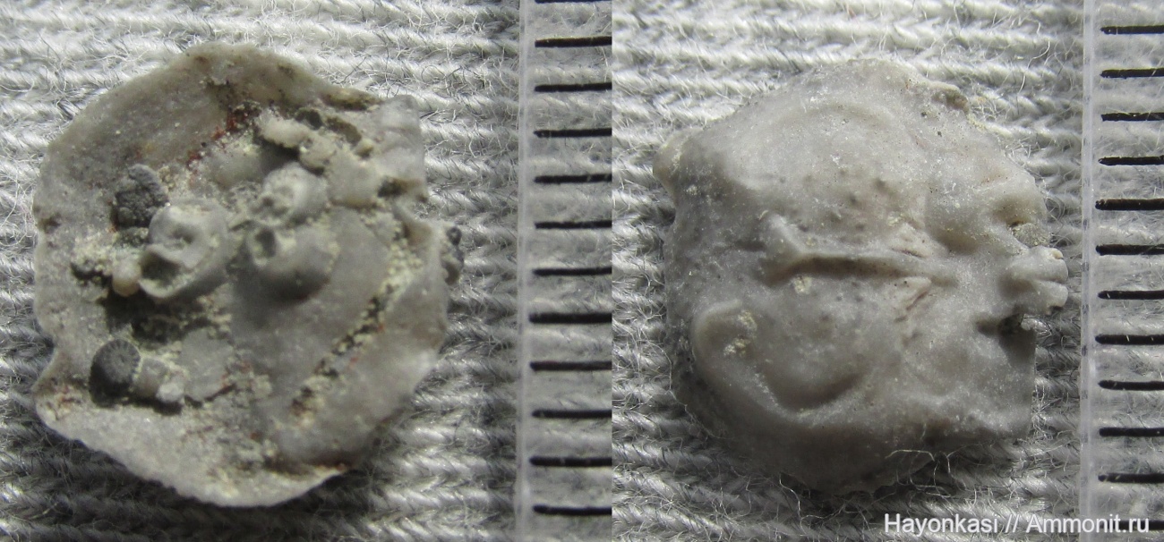 Верхняя створка брахиоподы Irboskites fixatus с обрастателями-микроконхидами. Верхние створки этих брахиопод, тонкие и плоские, отделившись от раковины, быстро разрушались. Редко удаётся найти целый образец.