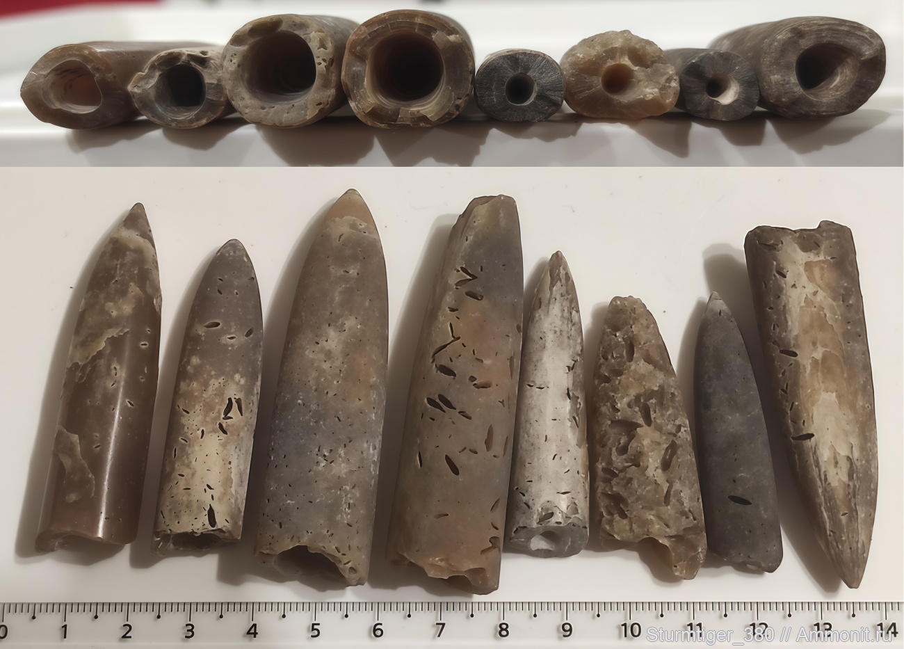 Эти ростры белемнитов при захоронении и минерализации подверглись сверлению и выеданию детритофагами (мелкими усоногими рачкам и, может быть, другими организмами), когда долго лежали на дне.