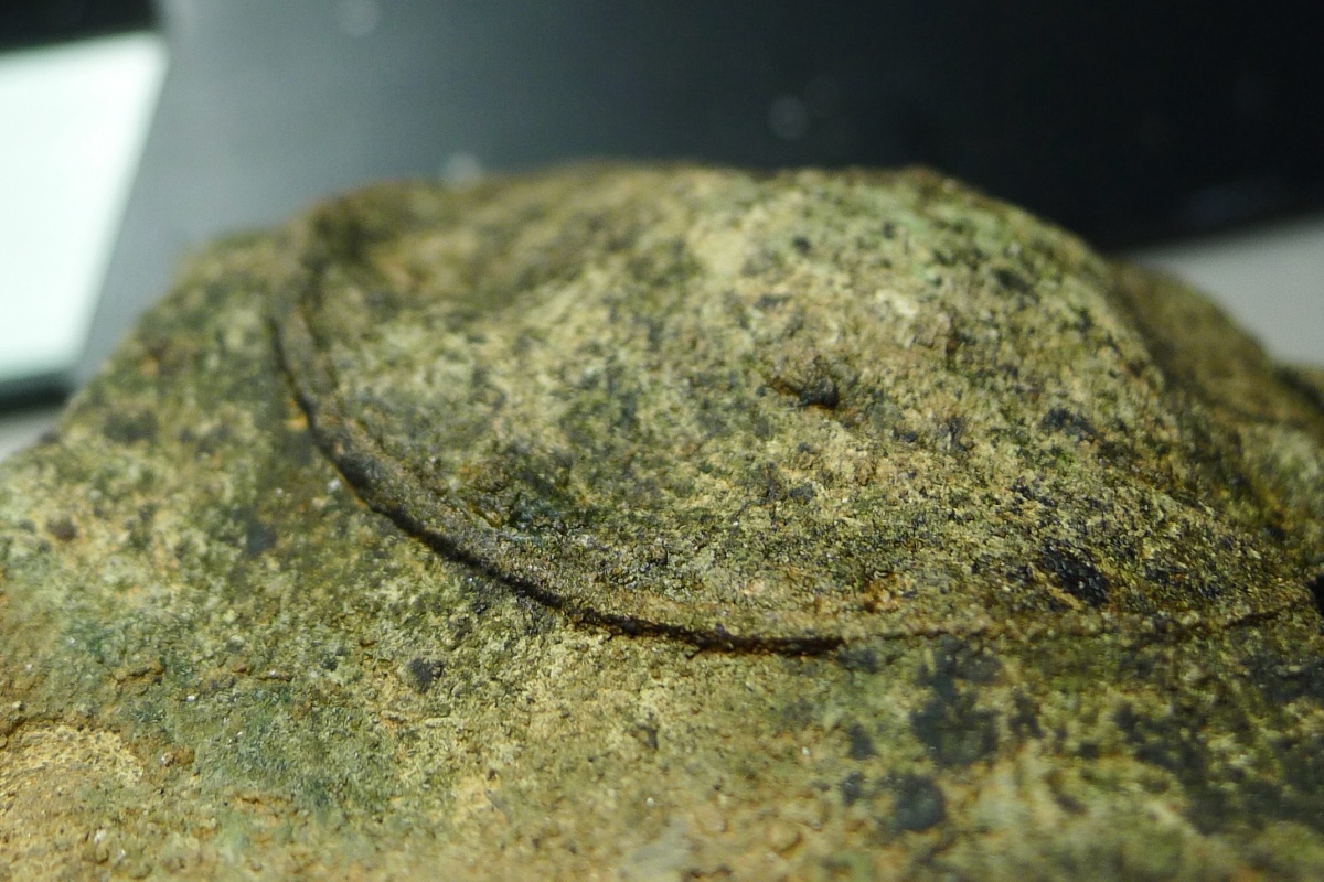 Поверхность образца в тине. Протрите щеткой участок этого круга. И дальше надо рассматривать его под микроскопом. Смотреть, чем выполнено - кальцит, "хитин", фосфат, слепок? Уходит ли вниз внутрь породы? Есть ли на нём какие-либо текстуры?