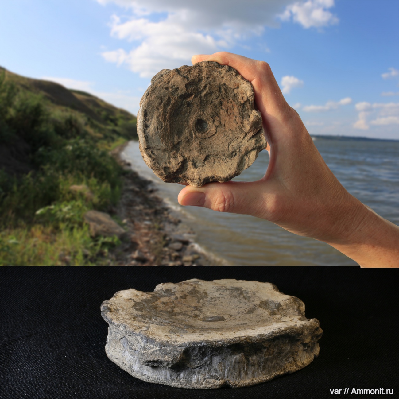 Находка середины августа 2025 г. Вероятно, волжский ярус. Первый в моей коллекции кашпирский позвонок. Позвонок "отловлен" в воде у самого берега. Максимальный размер - около 9 см. Большой, но поврежденный и странно сжатый, как бы "сплющенный", образец. На верхнем фото - позвонок в руке супруги.