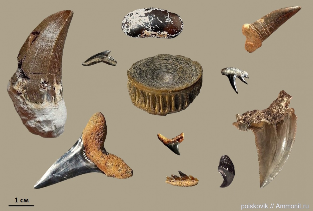 Зубы и кости рыб и рептилий, найденные нами в осадочных породах Крыма.