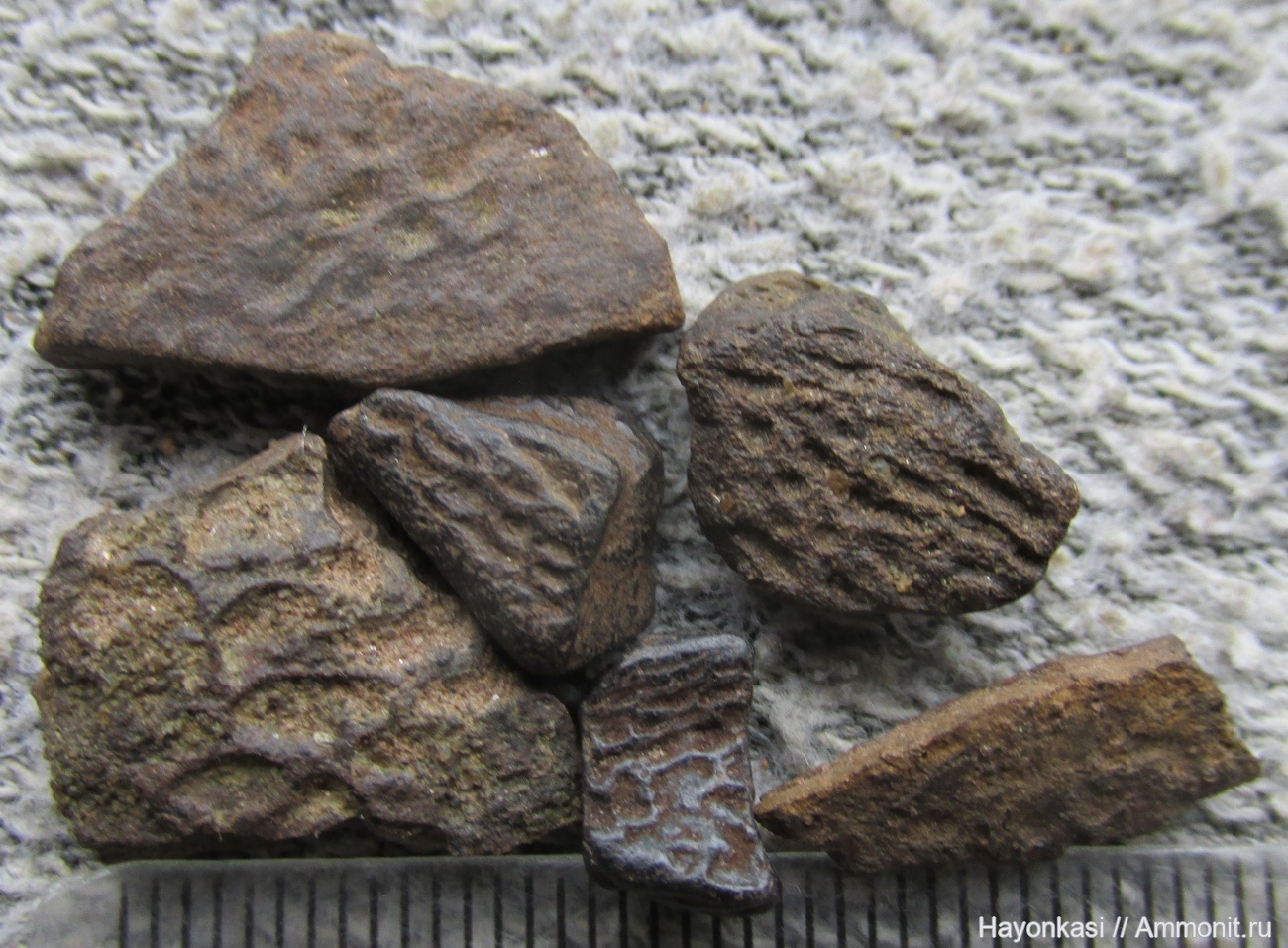 Фрагменты пластин плакодермы, предположительно Antiarchi, с полосатым орнаментом. На этой точке встречаются очень редко.