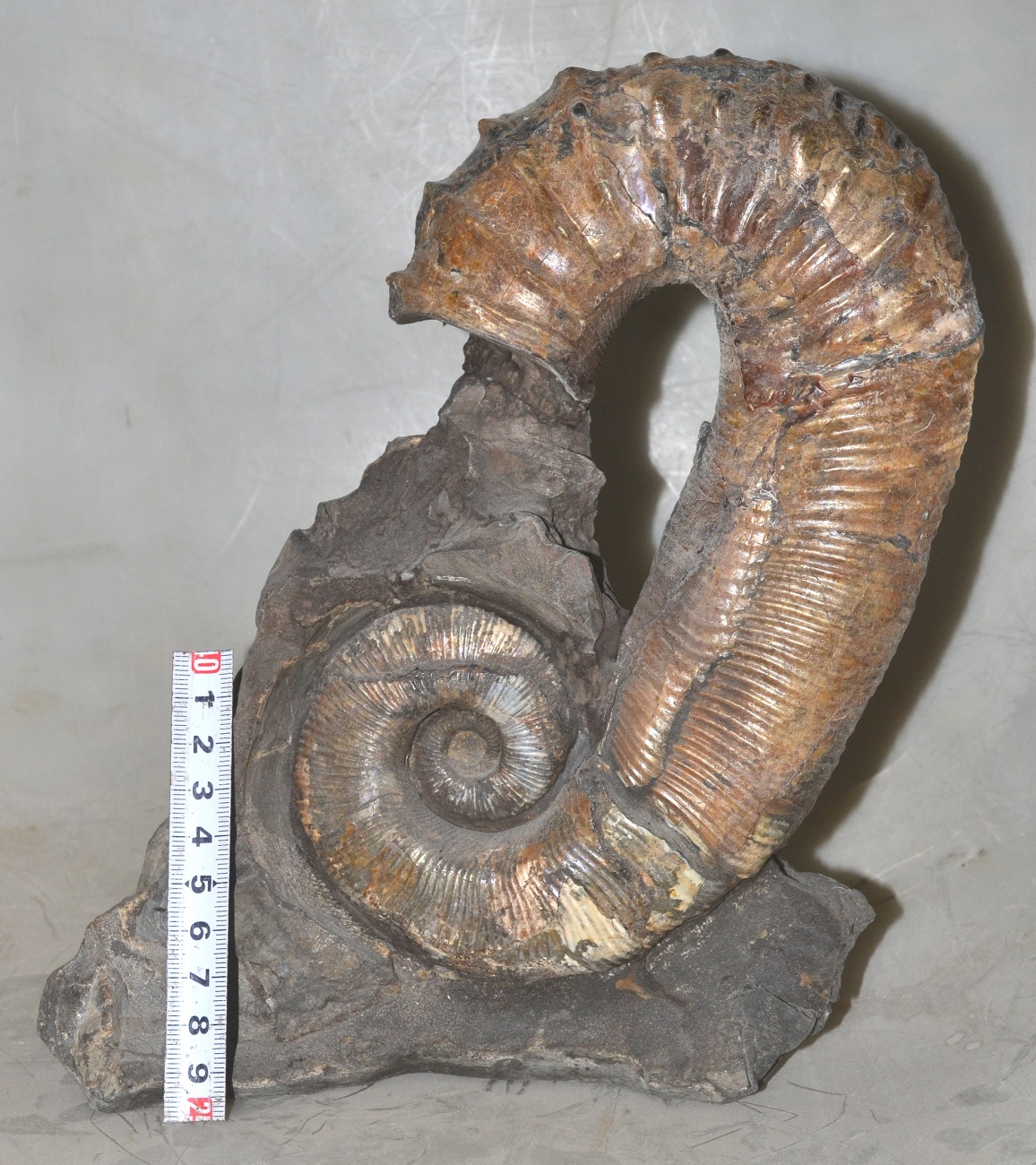 Натуральный образец с сохранившейся спиралью.Фрагмокон в полном объёме. Жилая камера раздавлена, но не вся. Последние пять сантиметров жилой камеры в полном объёме. Пример избирательной раздавленности. Первый раз такое наблюдаю. Думаю кто то из активного нектона схватил этого аммонита при жизни и раздавил.