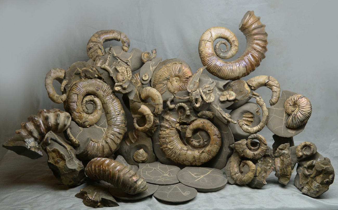 Палео группа с аммонитами из горизонта конкреций с Proaustraliceras.Инсталляция собрана для музея Истории Мироздания в г.Дедовск. 100х50 см.