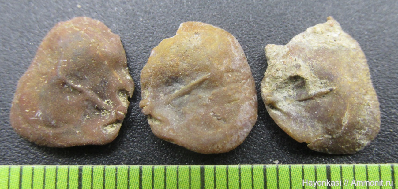 От брахиоподы Irboskites fixatus обычно сохраняется только приросшая к субстрату нижняя створка (плоский "блинчик" или, реже, "чашка" с поднятыми краями). Но изредка попадаются верхние створки-"крышечки". Здесь они кверху внутренней стороной.