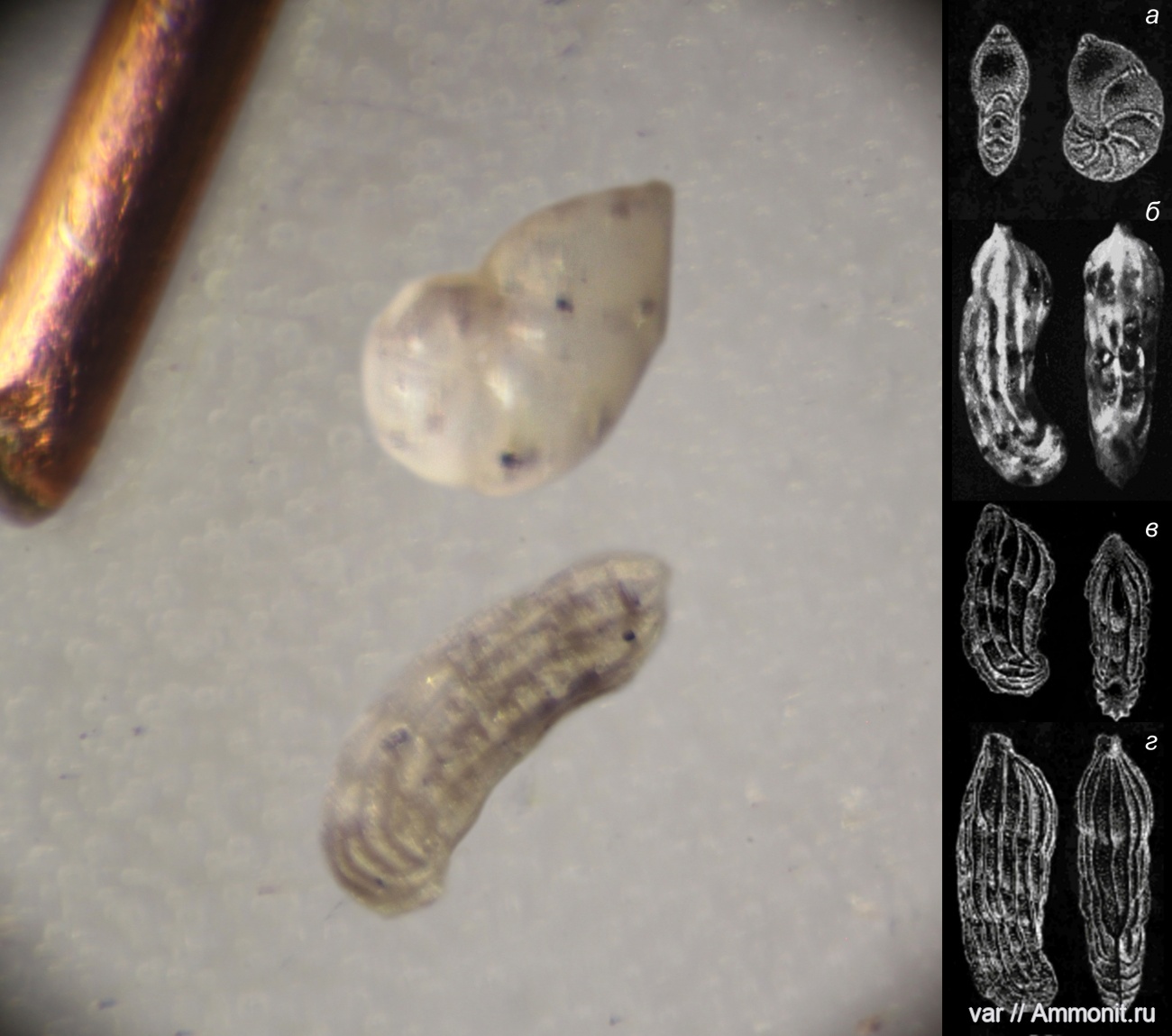 В результате предпринятых попыток самостоятельно определить находки могу осторожно предполагать, что верхний образец относится к роду Lenticulina. Из наиболее распространенных в районе находки видов - Lenticulina biexcavata (Mjatl.), справа на врезке рис.а.