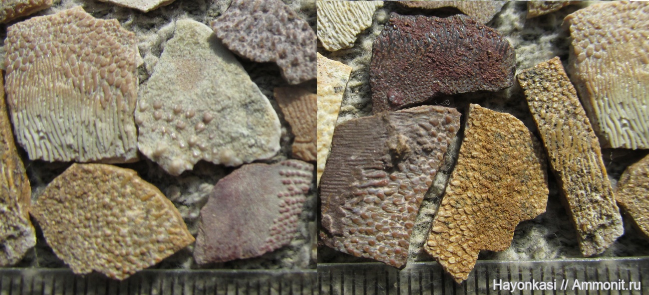 Повреждённые чешуйки саркоптеригий, предположительно Glyptolepis sp., из пёстроцветных печорских глин. От чешуи из Писковичей отличаются большей толщиной (разница в доли мм), а также меньшей хрупкостью (менее разрушены воздухом, водой и перепадами температуры).
