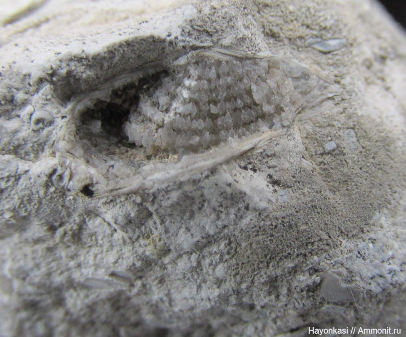 В одном из каменных блоков стены - вскрытая раковина (предположительно Атрипида); сохранился ручной аппарат брахиоподы, "проросший" кальцитом. Даже странно, что сразу не рассыпался, при таком-то размере кристаллов...