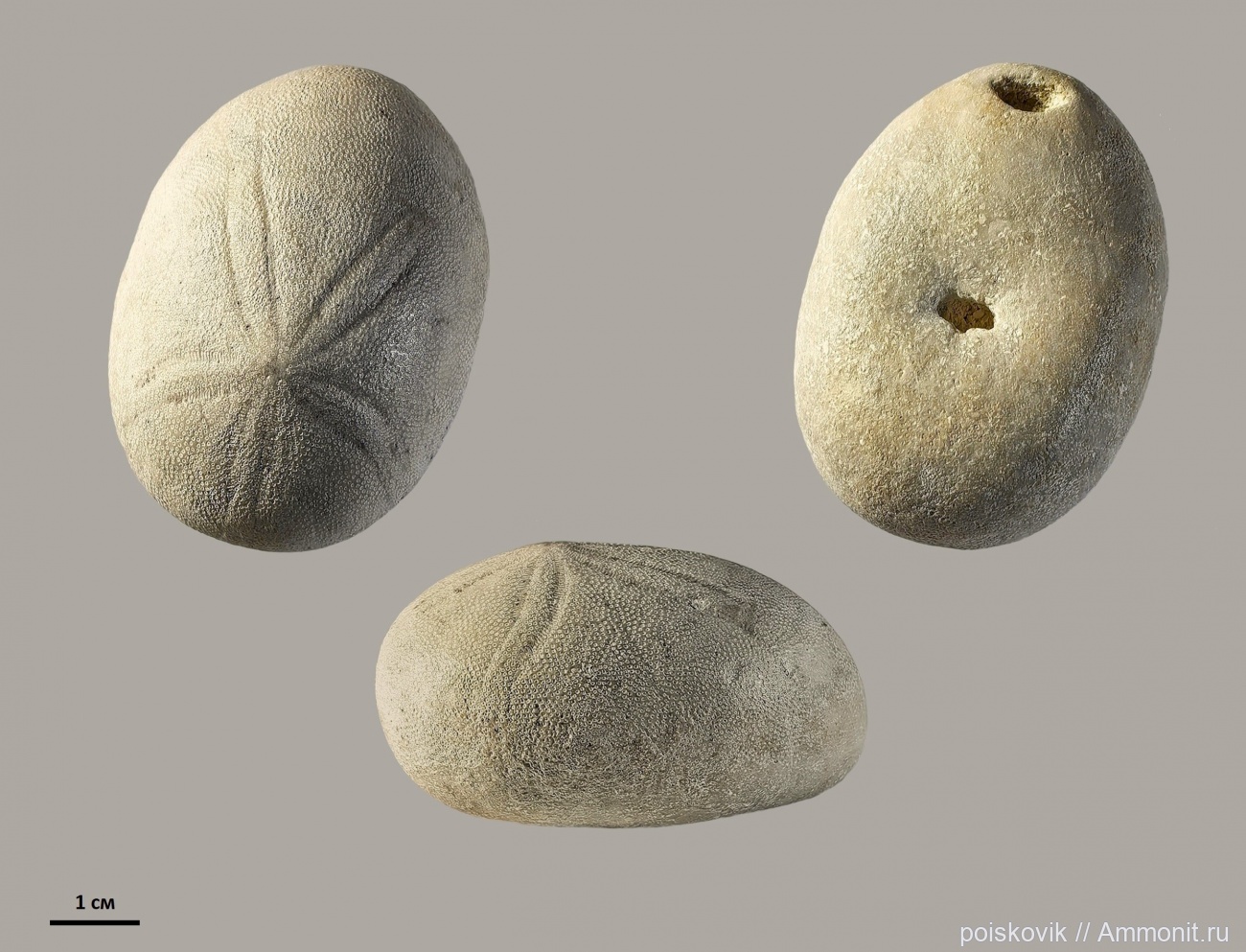 Морской еж Echinolampas leymeriei (в 3-х проекциях) из палеогеновых отложений в окрестностях с. Пролом