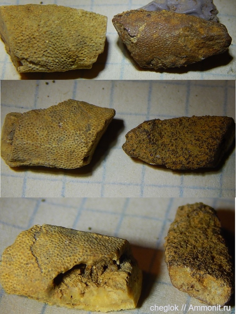 Недавняя поездка в Гжель была достаточно богата на интересности. Эти два фрагмента из келловейской глины трактовать сложно. Если правый хоть как-то напоминает фрагмент ракообразного, то левый вообще загоняет с ступор. Мшанка? Коралл? Губка? Буду благодарен, если кто поможет разгадать.