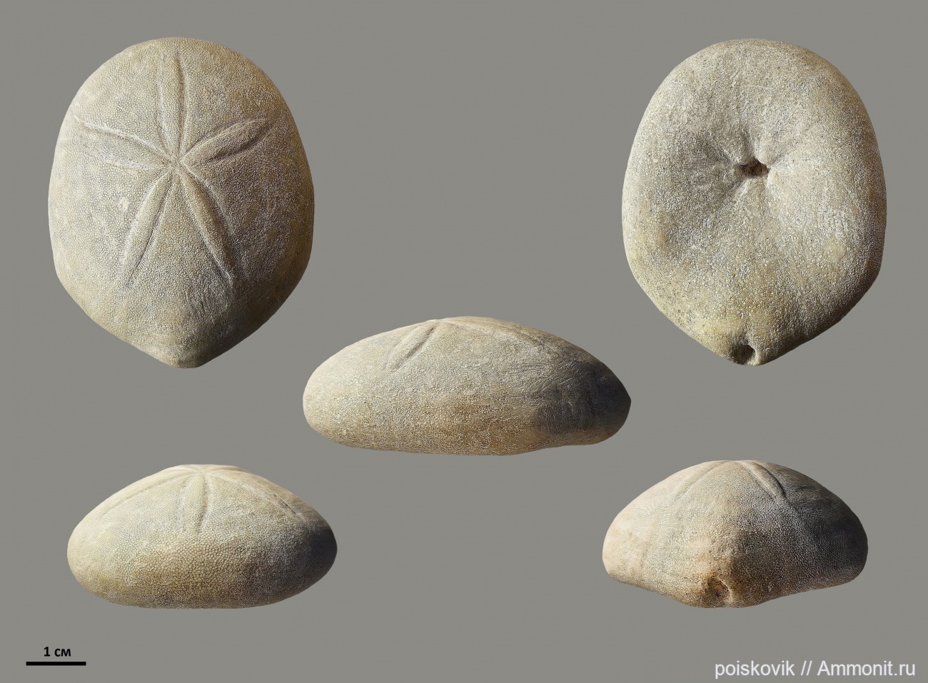 Морской еж Gitolampas (в 5-ти проекциях) из эоценовых отложений в окрестностях с. Пролом.
