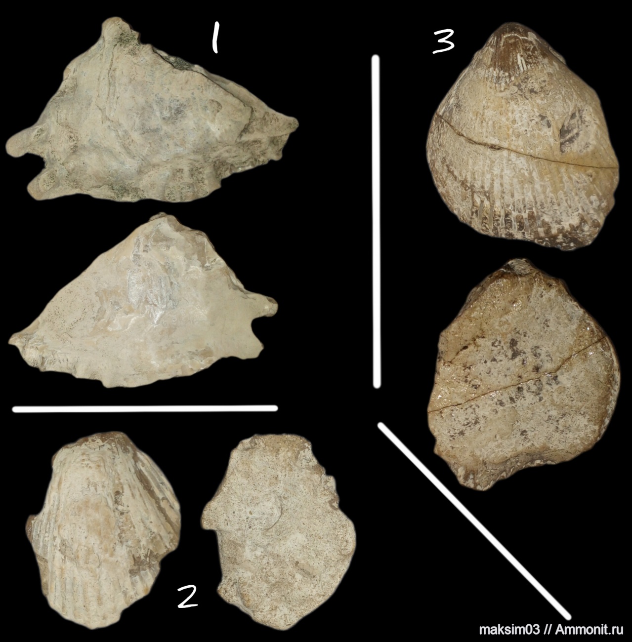 под номером один да, створка устрицы, не совсем целая, верхний край створки немного отколот, на счет второй да, очень плохо сохранилась, но очень сильно похожа на Neithea quiquecostata, третья посмотрел, возможно и Chlamys