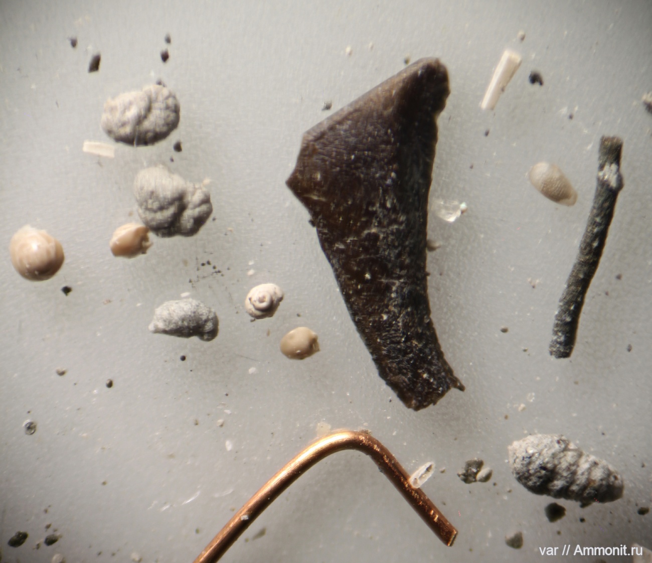 Фрагмент чьей-то, возможно, рыбьей, кости в окружении раковинок фораминифер, остракод, обломков спикул губок и чего-то совсем неопределимого.