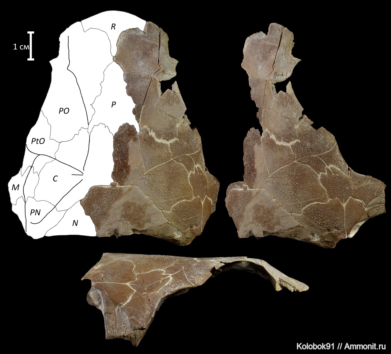Фрагмент крыши черепа пахиостеоморфной артродиры.