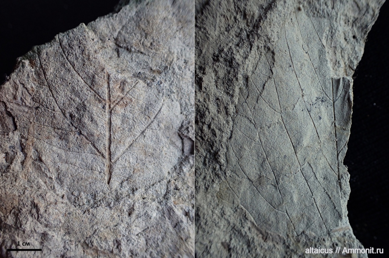 Отпечатки листьев Paraprotophyllum antibessiense (семейство Platanaceae), аргиллит. Кемеровская область, пос. Антибес, верхний мел, коньякский ярус.