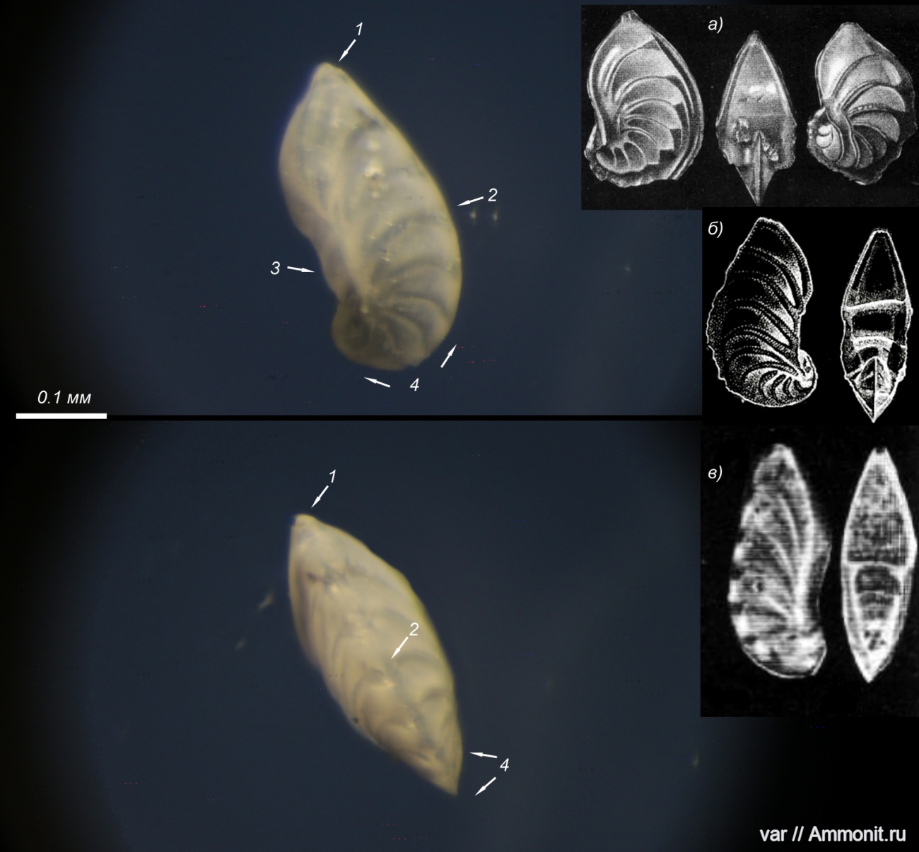 В описании, в частности, сказано: Раковина маленькая, слабо расширяющаяся к устьевому концу (1), узкотреугольная в поперечном сечении. Спинной край (2) в очертании слабовыпуклый, брюшной (3) слегка вогнутый или почти прямой…. Общее число камер 7-8, реже 9. Первые 4-5 образуют спиральный отдел (4), слегка выступающий на брюшную сторону, последующие – развернутую часть раковины.