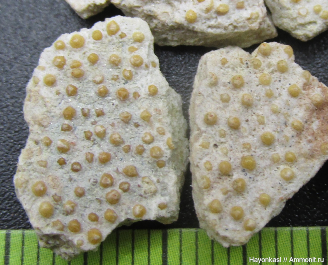 В прослойках белых песков и зелёных глин в верхней части карьера останки Artrodira довольно редки; там преобладают фрагменты панцирей Antiarchi. "Белые" фрагменты Artrodira (предположительно Homostius sp.), для статистики.
