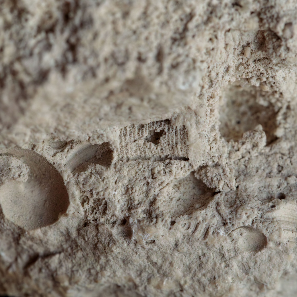 Булыжник найден в осыпи в карьере на 41 км, с разных сторон оказался богат на остатки фауны. Сам камень размером порядка 10 см в длину, размер образцов на нем от мм до пары см. Возраст - предположительно начало Пермского периода либо конец Каменноугольного.