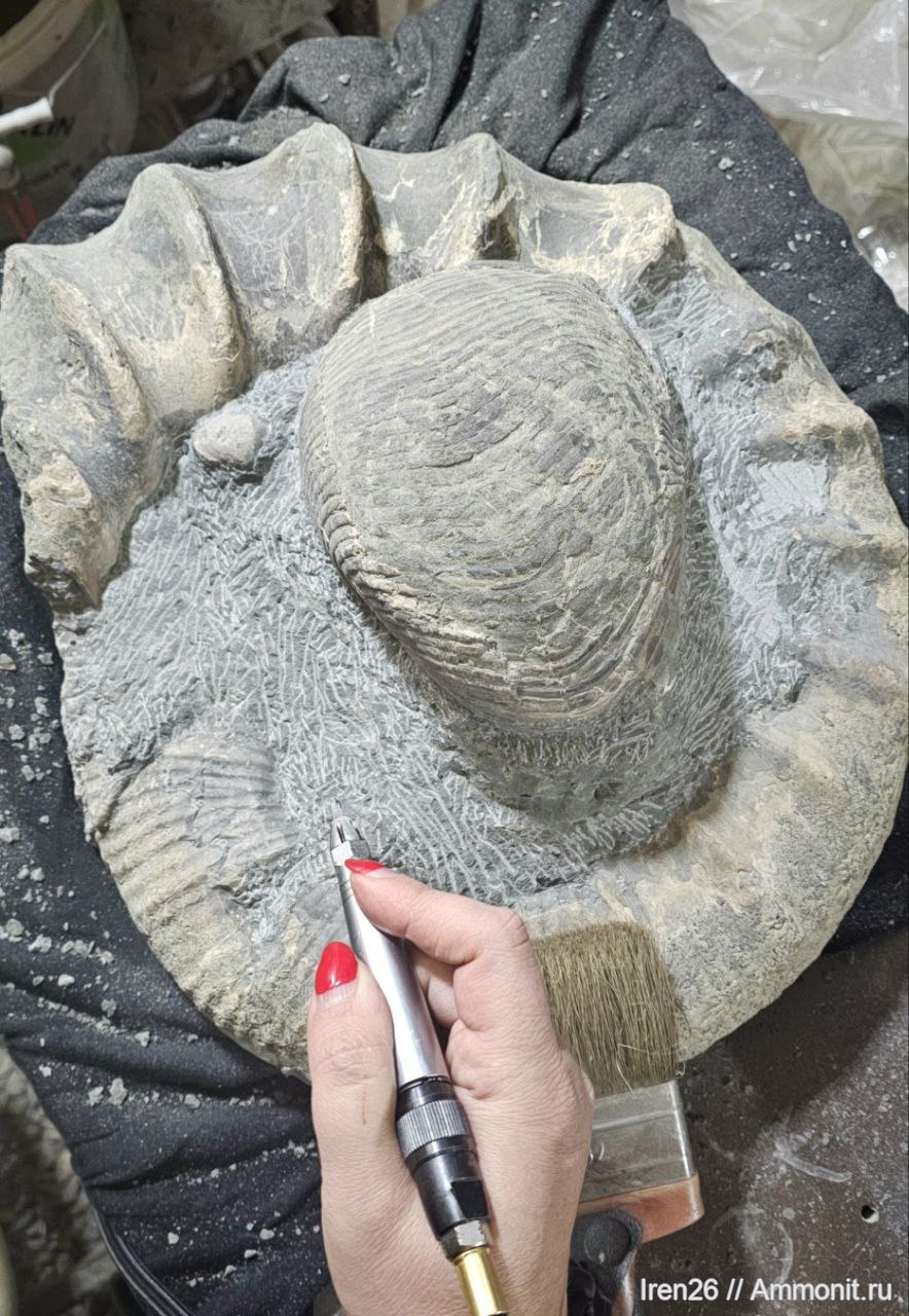 Такие находки редки: обычно аммониты и наутилоидеи встречаются поодиночке или уже в разрушенном виде, а здесь — целых два образца в естественной «упаковке». Конкреция защитила раковины от механического разрушения, сохранив тонкие детали рельефа. Аммонит в одной матрице с наутилоидеи позволяет изучать их совместное обитание, возраст и условия осадконакопления. И сейчас мы приступили к их препарации. Очень интересно узнать, что скрывается под породой?!
