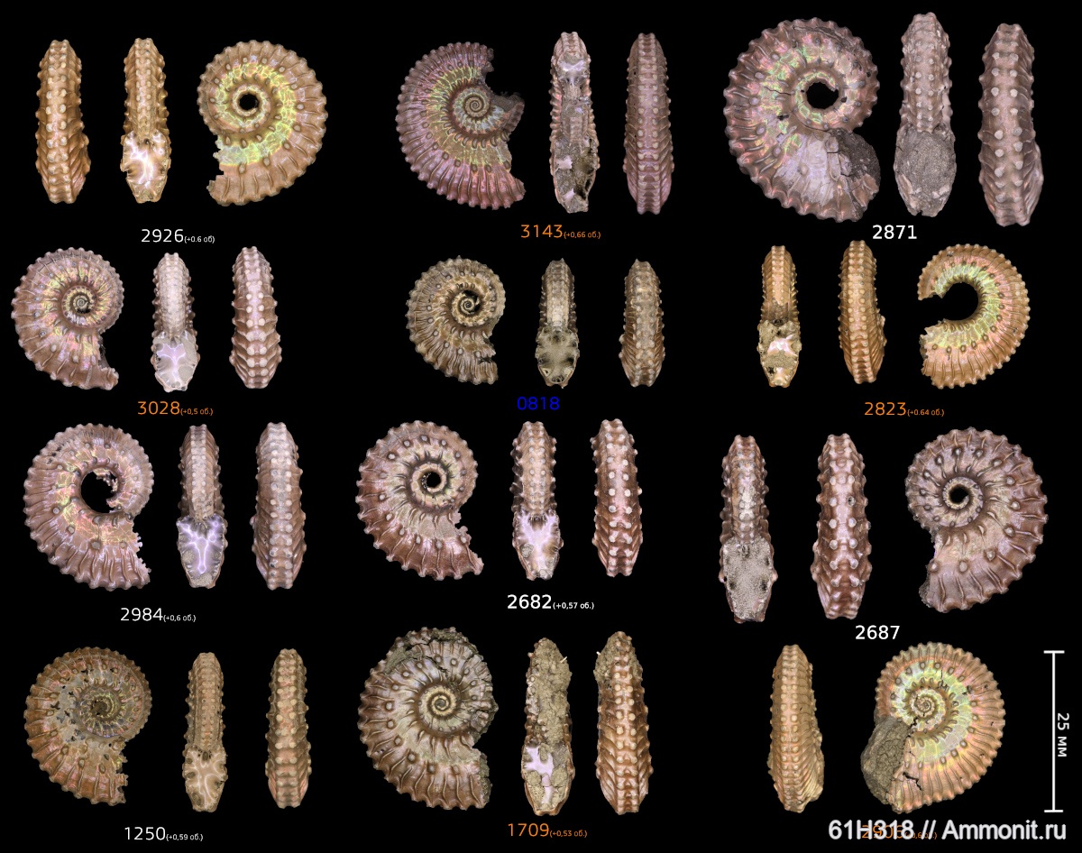 Оранжевый цвет подписи — раковина лежала в слое с Erymnoceras’ами, белый — в среднем келловее выше слоя Erymnoceras’ов, синий — верхний келловей. В скобках указано угловое расстояние в оборотах от конца фрагмокона до устья (± соответствует следу от раковины на фрагмоконе).