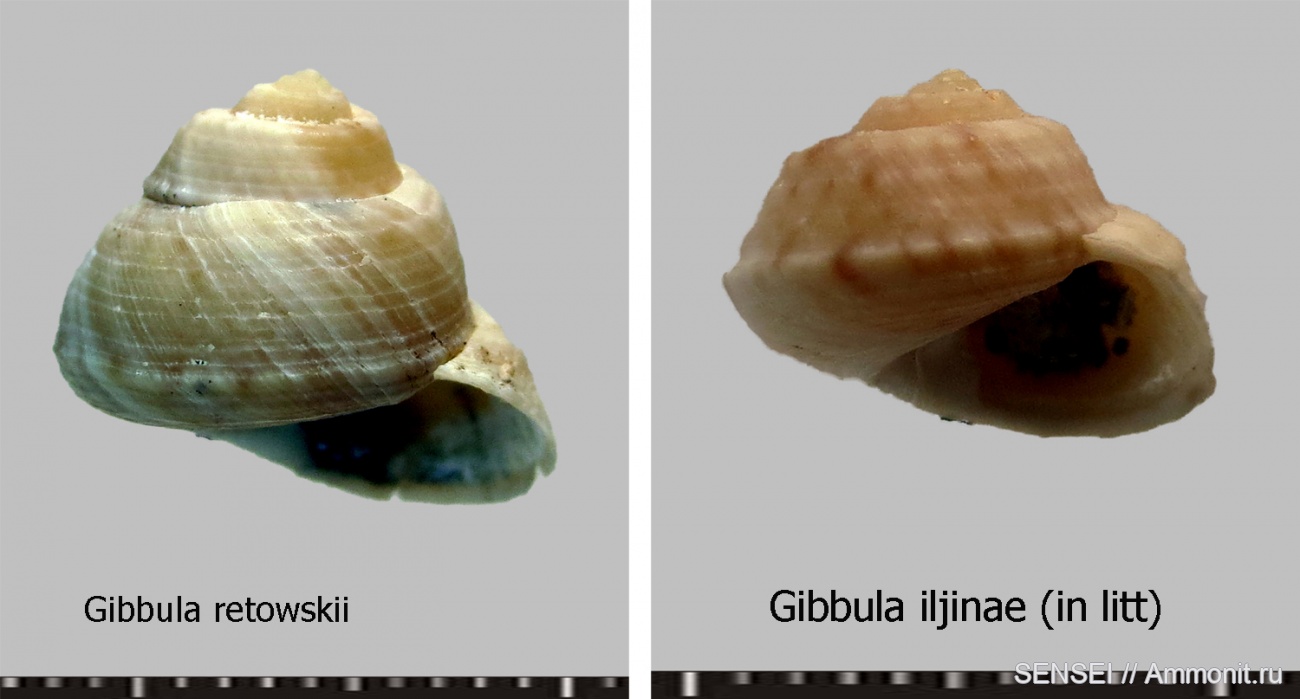 Правая на фото раковина была ранее мной ошибочно определена как G. retowskii, но после консультации с ув А. Гужовым пришли к заключению, что это новый вид гиббул G. iljinae, in litt, ещё не опубликованный, поэтому только рабочее название.