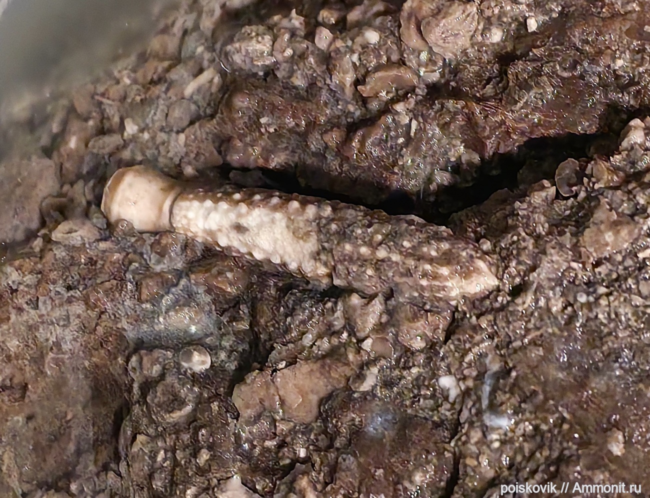 Игла морского ежа (длина 3 см) на месте находки. Оксфордские отложения в окрестностях Золотого пляжа Балаклавы.
