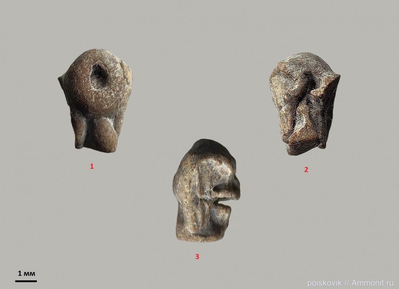 Нашли три сросшиеся брахиали от кроны бесстебельчатой морской лилии отряда Comatulida с отверстием - следом жизнедеятельности паразита. На фото брахиали в 3-х проекциях: наружная поверхность – 1, внутренняя – 2 и сочленовная – 3.