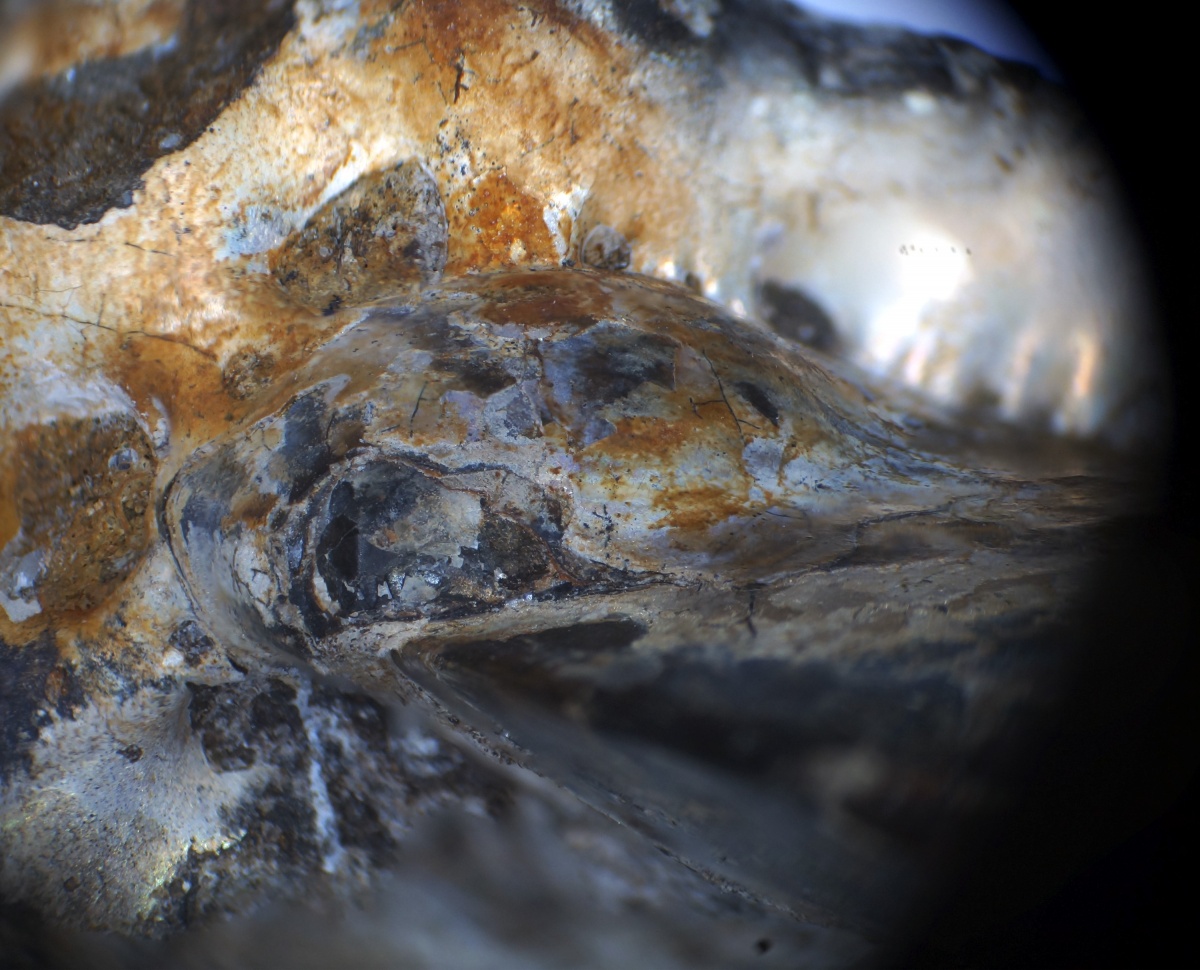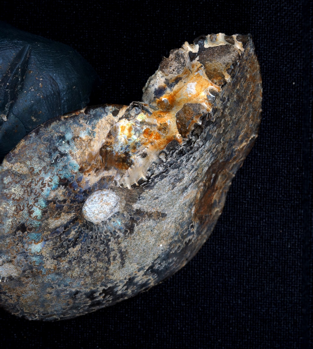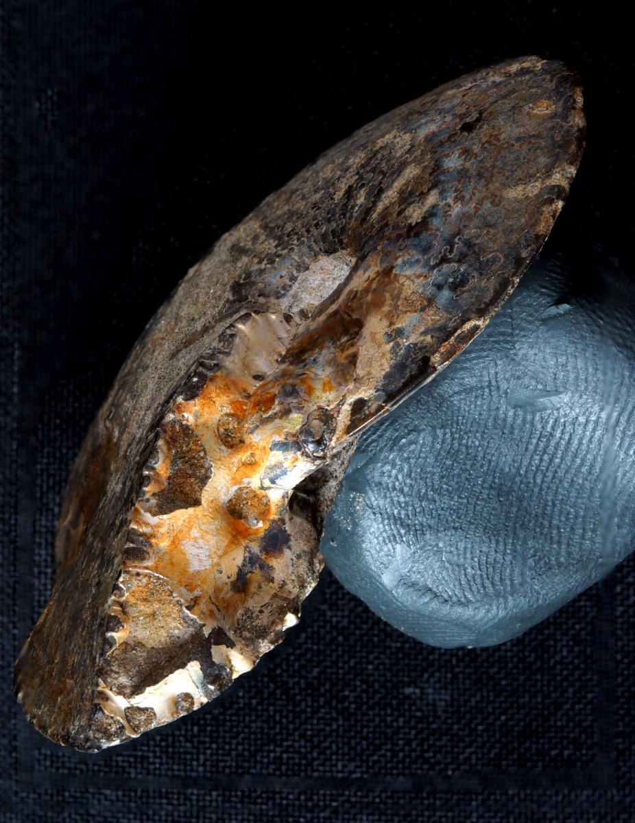 Благодаря отломившейся части ядра аммонита возле устья обнаружилась интересная деталь. На аммоните был прижизненный обрастатель двустворчатый моллюск, которого аммонит замуровал в свою раковину и благополучно продолжал жить до своей кончины.
