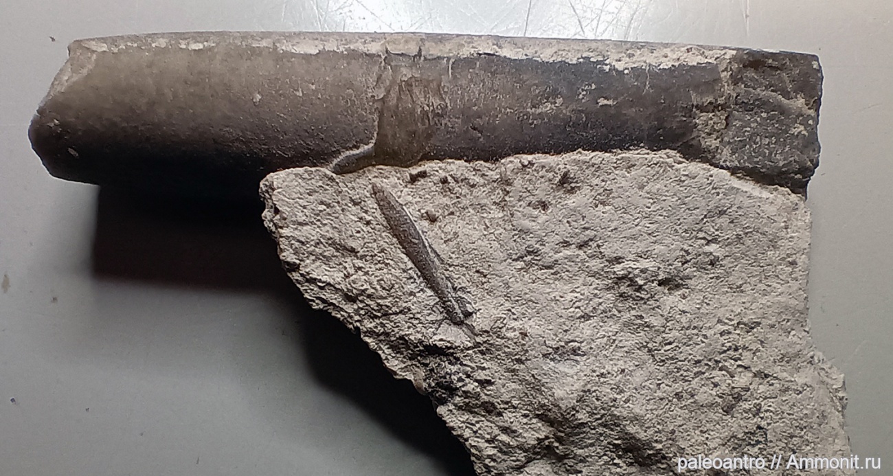 Фрагмент белемнита и маленький белемнит. Находка в строительном гравие.
