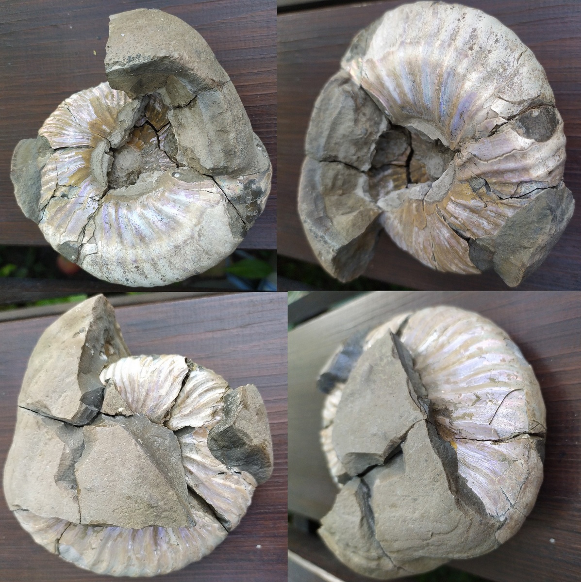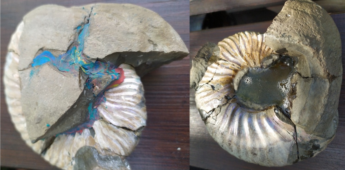 Аммонит находился внутри конкреции и при извлечении крайне неудачно раскололся на фрагменты. Такие обычно не берутся и остаются на месте находки, но этого почему-то решил забрать. Собрал куски в пакет, положил дома в коробку с "некондицией" и благополучно забыл про него на несколько лет. Разбирая осенью коробку, случайно наткнулся на него и решил хоть что-нибудь "вытянуть" из этой кучки обломков.
