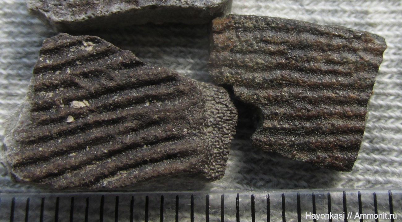 Фрагменты покровных пластин плакодермы, предположительно Holonema, из серых порховских глин.